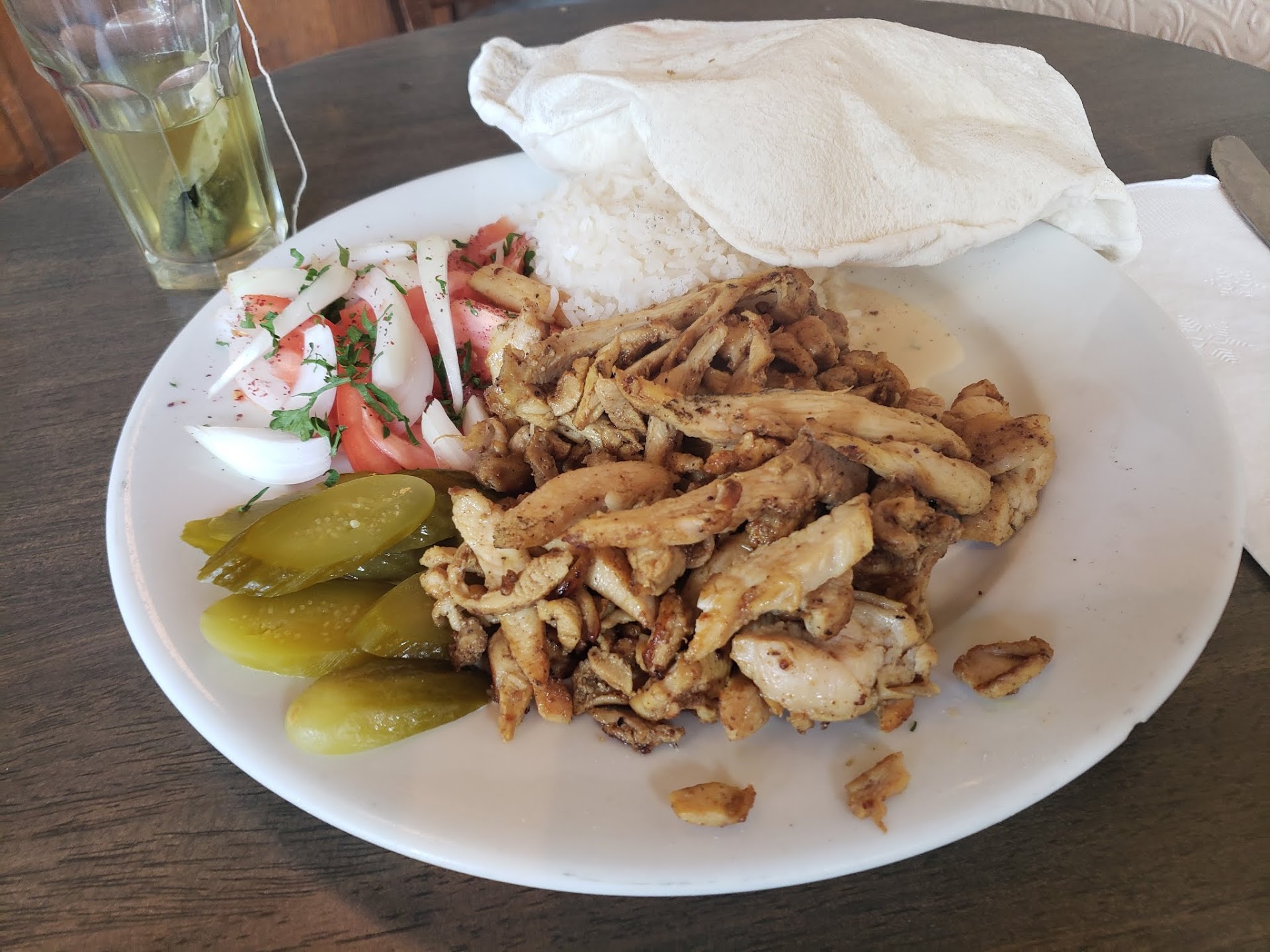 Eventually it came and as I ate, I wondered why it was so thin. It had very little flavor, and no chewiness of normal pita. Then it hit me - they used pizza dough! It certainly had the same bland taste as pizza dough. They stretched it out like pizza dough, but very thin. Interesting, but less effective than normal pita, because pita is thick enough that hummus or baba ganoush doesn't feel like it will soak through or drop out of the bread. Mine kept dropping out because the bread was so thin you couldn't grip it firmly or it would have torn.