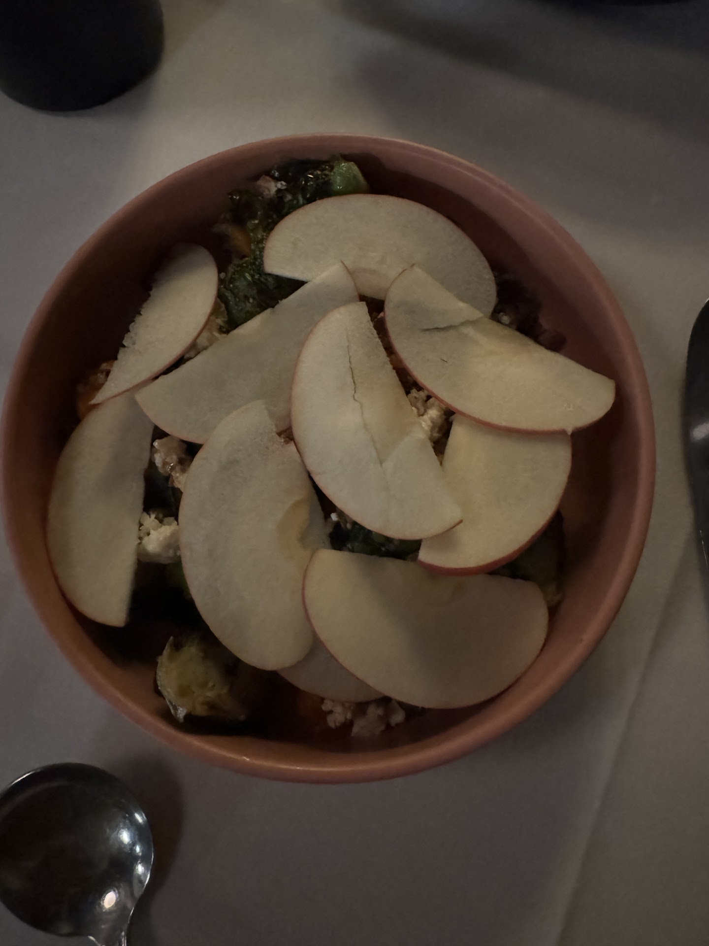 Appetizers: -Brussels sprouts salad with sliced apple, marinated feta, roasted squash, candied pecans, quinoa and tossed in a vinaigrette Kabocha squash ravioli in a braised beef and peanut ragu, crispy eggplant and a peanut-green bean crumble.