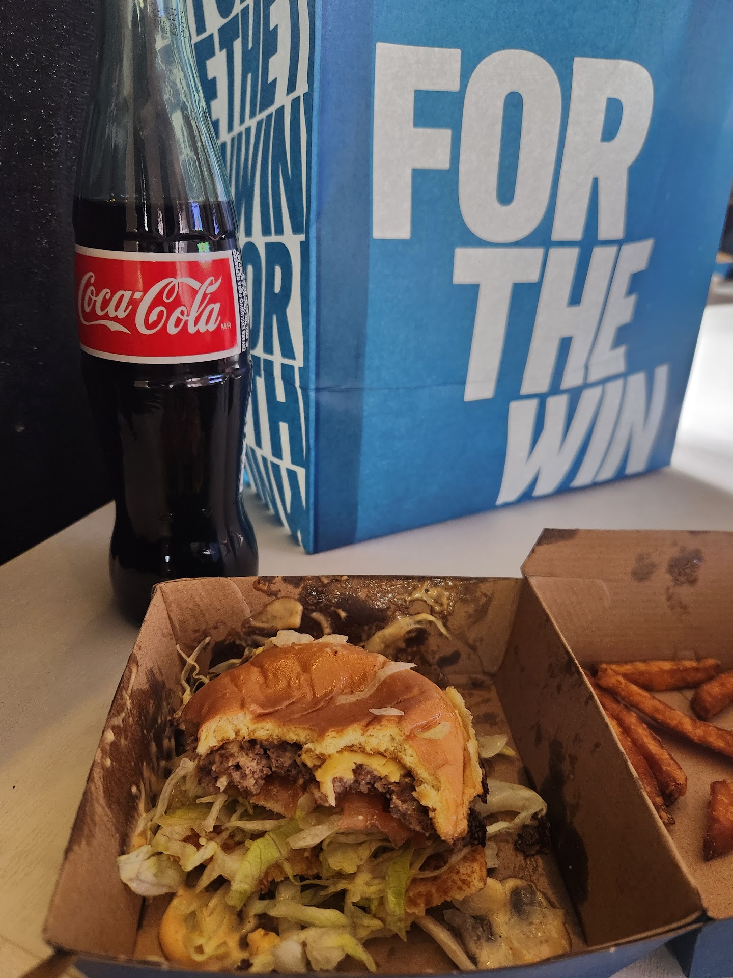 I decided to check For the Win Montebello last night, National Cheeseburger Day, and i had a great time. Just like the other for the Win locations that I've been to, it was a great place to meet with friends, or sit by myself at. For the Win Montebello is located inside of a building called Blvd. Market that has For the win, a pizza place, and a bar inside. Good service and very clean place. There is both an indoor seating area and an outdoors seating area. When I received my bacon smashburger and woth cheese and sweet potato fries I noticed that the packaging was high quality and had a nice, modern, and artsy design. The smashburger and fries were also at a bite for bite non-stop. Great quality ingredients. Local news station KTLA 5 did a news segment on For the Win saying its the best cheeseburger in Callifornia, echoing the loving sentiments of yelp.com and the Los Angeles Times. Inspiring me to dress up a smashburger with grocery store bought items: leaf lettuce, tomato, avocado, and red onion. I'll be back for more For the Win. Im going to check out the other locations and soak up the sights to see as I walk around the interesting shop and bar lined areas...For the Win Montebello is located on a shop and bar lined stretch of historic lowriding...