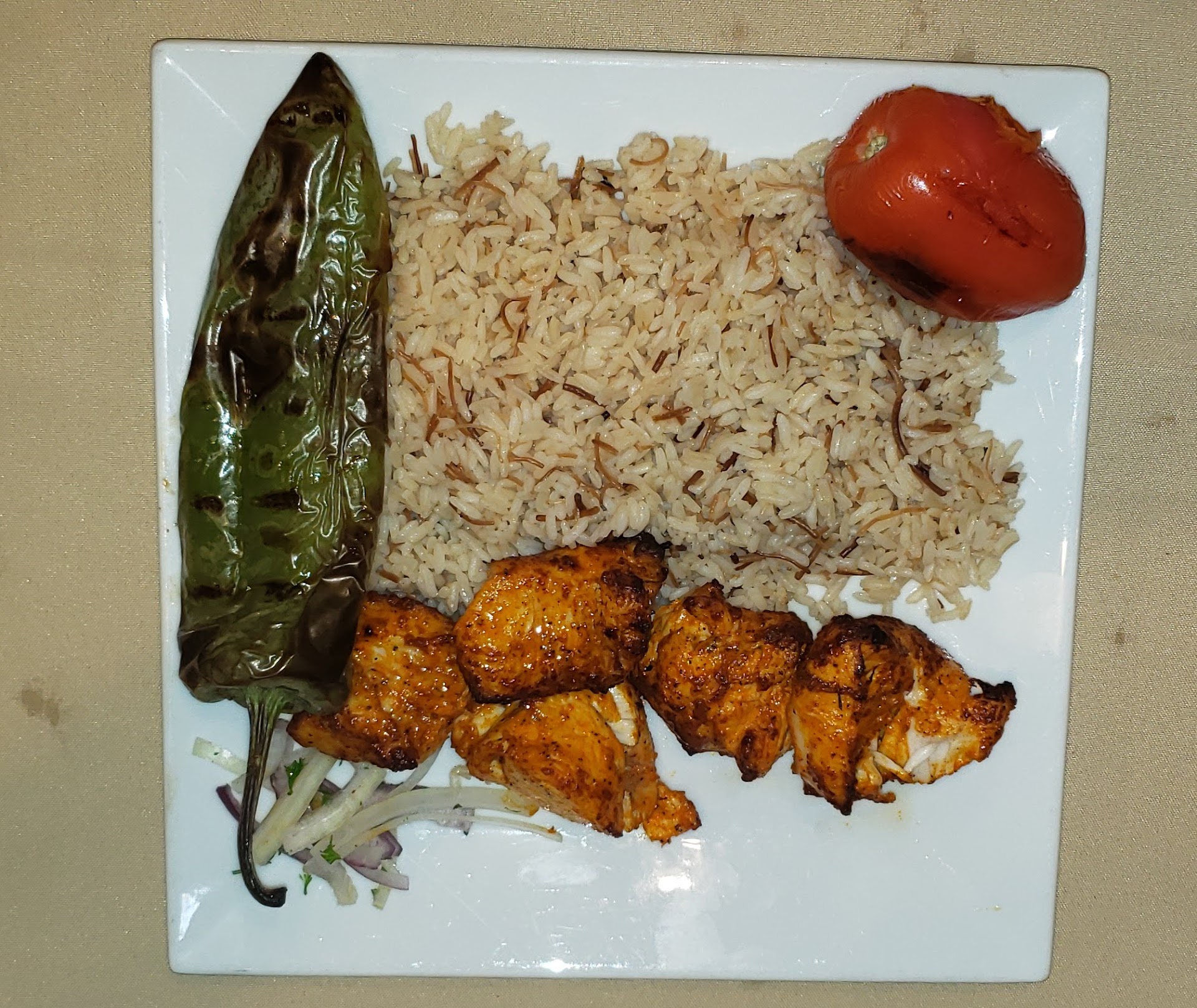 When our meal real we left and headed home but the aroma from food amazing and also we got a new car scent from the food. I open the container and food looks so good but the taste incredible good so much flavors in the chicken breast kabobs season good cook perfect all the spices seal in chicken while cooking. The hummus was good then I try the rice pilaf also good then roasted vegetable very good then use the pita bread to complete the meal. The garlic spead was good but little bit strong flavor but my wife say it was little bit strong for her.