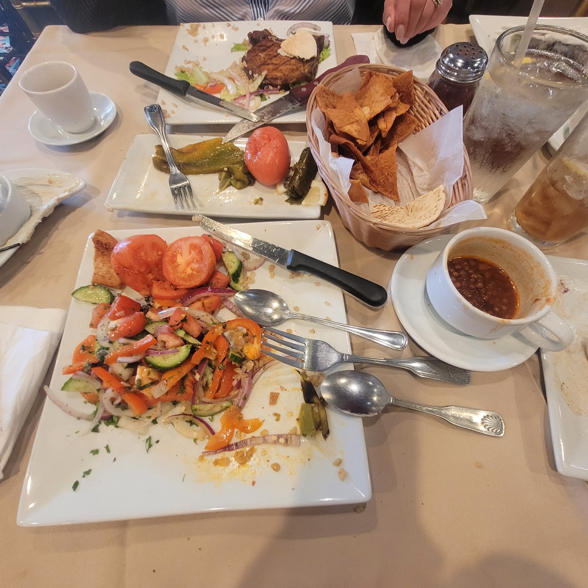 Stuffed Grape leaves(sarma), eggplant hummus(moutabal), very-creamy hummus (whipped garbanzo beans), bulgur(wheat cooked like rice) and the rest taste like homemade. FYI: Armenian salad has no lettuce vs. Greek salad, which does. Red Lentil soup served hot and seasoned to perfection.