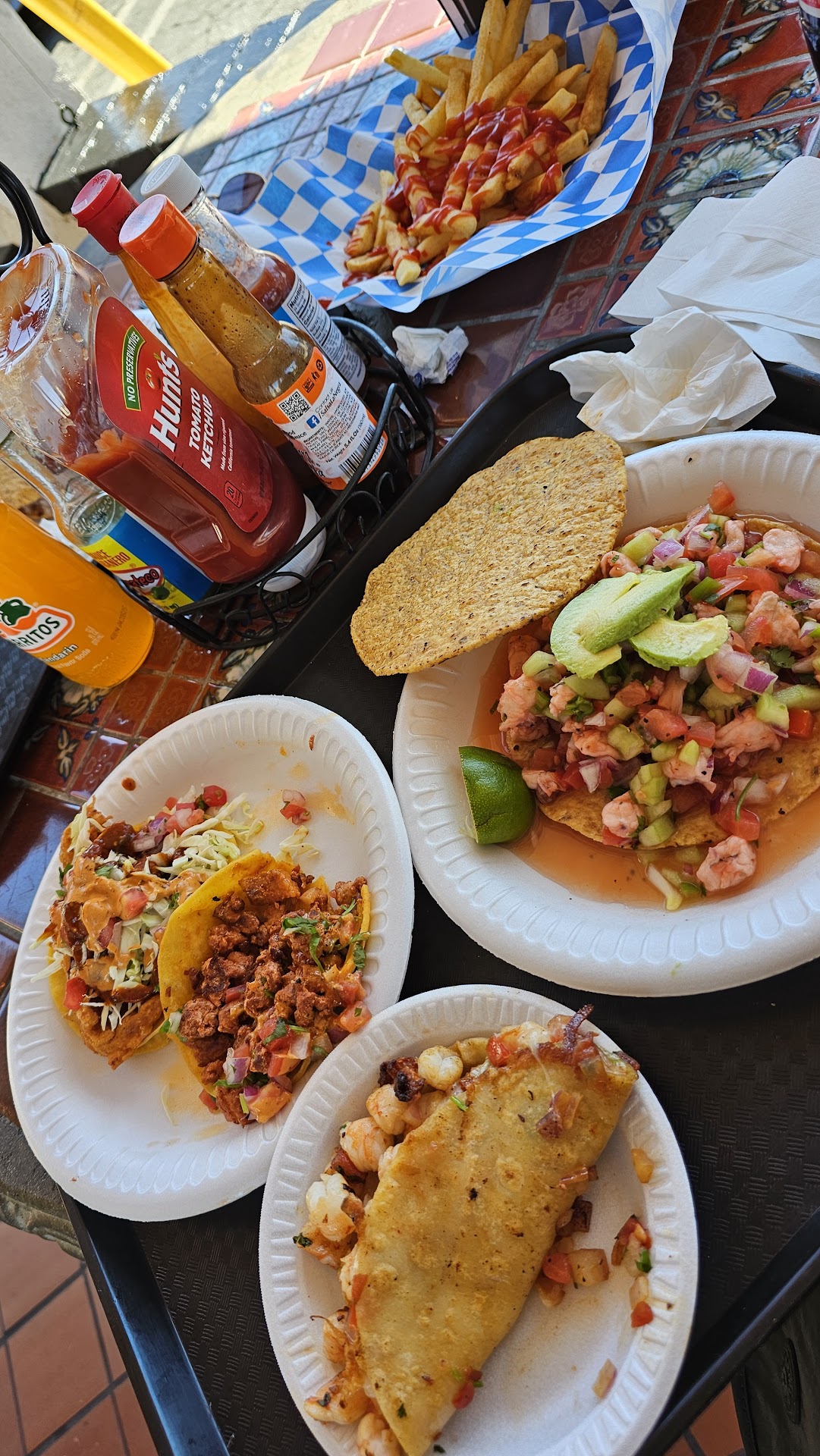It's a little street corner spot that can easily be missed or may not seem too appealing but the food is great! The service was nice & friendly, the space was clean and pleasant. Went on a Sunday afternoon and there was plenty of parking. All the food we had was delicious. But in order of bestest... to still good: shrimp tacos, fish tacos, ceviche de pescado, taco al pastor, taco gobernador, shrimp ceviche. And we got fries on the side. The best shrimp tacos I have had are in Cancun... but these were almost as good 🤤 I will definitely come back...