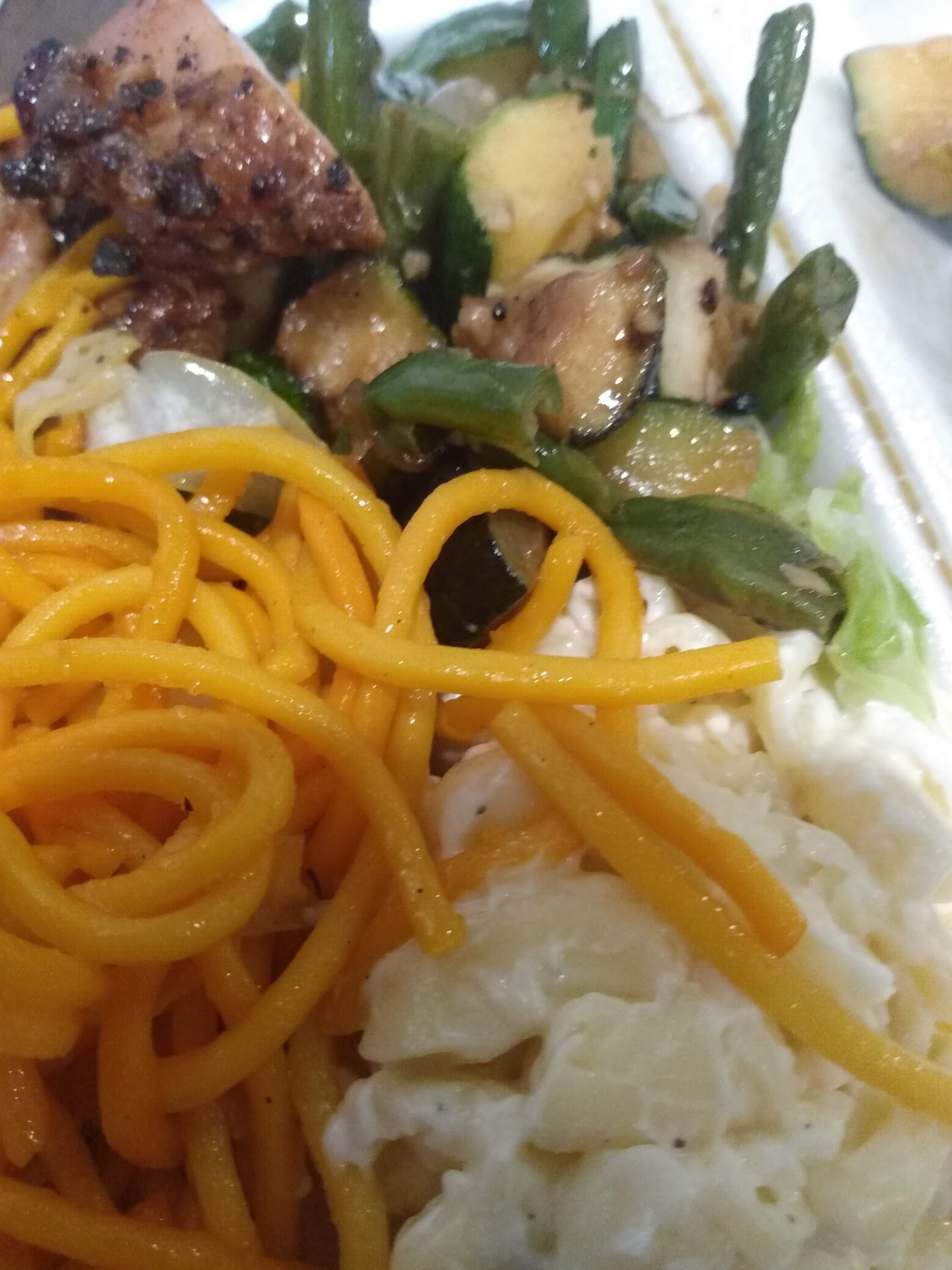 The noodles were just ok, the BBQ pork was disappointing since it really looked good, but it was so dry, the teriyaki chicken was tasty and not dry, and the orange chicken was just ok. The chicken egg roll was just ok - I didn't really notice chicken - it did had a strong ginger flavor though.