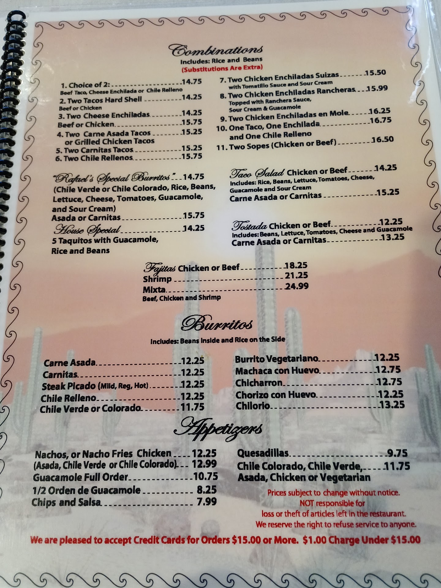 Read moreAfter a long day we were very hungry I told my wife let's go the Mexican restaurant by L.A. Fitness she yes. The restaurant called Rafael's Mexican Restaurant I look it up on Yelp they have good reviews the after we walk in the restaurant. The hostess greet us then show us the table hand us the menu and order our drinks. We we're looking at the menu and decided what to order. She a combination plate two chili renello comes with rice and beans. I order a combination plate also it have a chili renello,hard chicken taco and a cheese enchilada also comes with rice and beans. The waiter brought us chips and salsa they very good nice and warm and the salsa was good and little bit spicy.