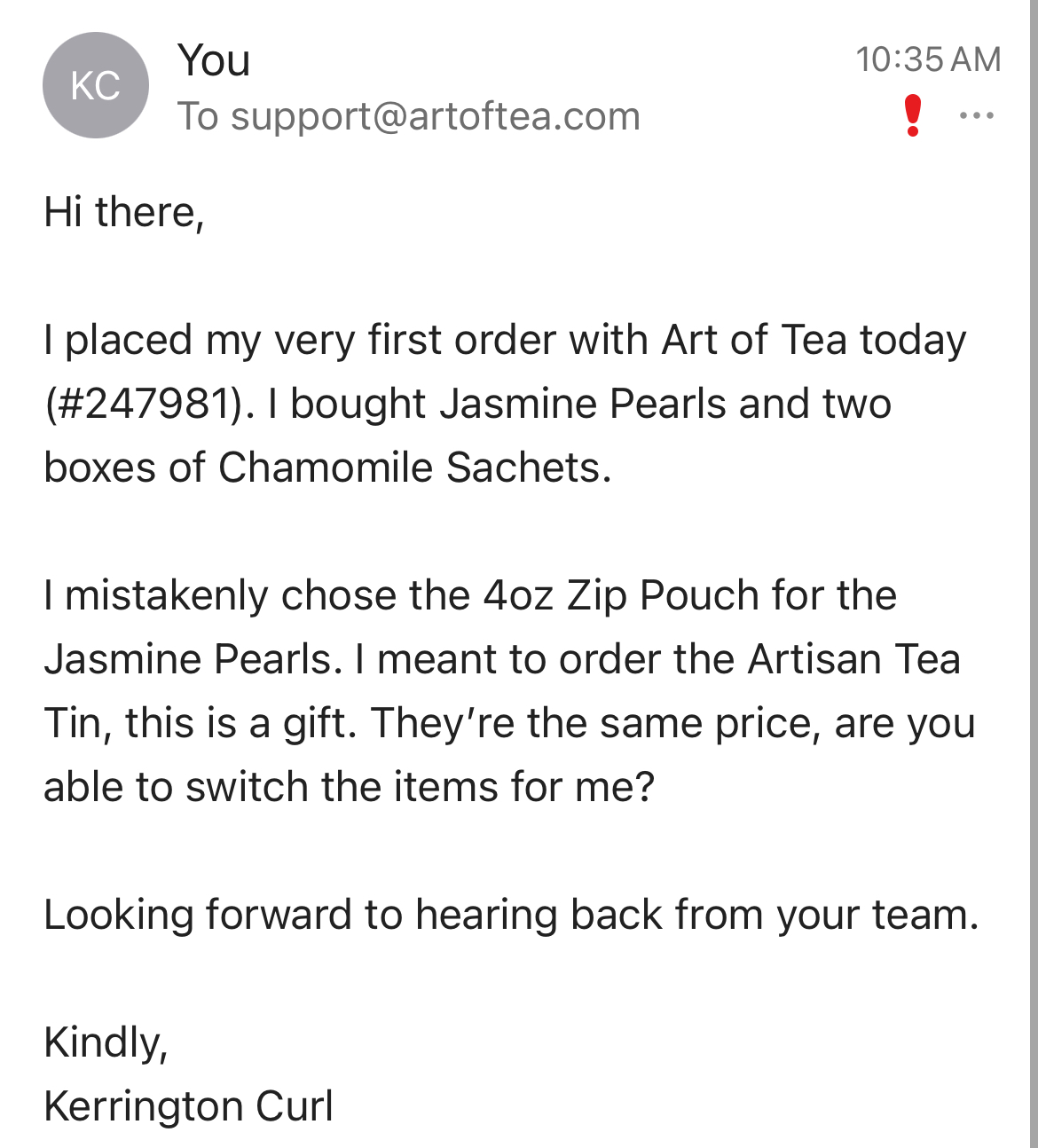 Read moreI ordered a matcha Infuser and unfortunately it came broken. I called customer service today and they replaced it right away. It’s on the way now. As far as the tea that I ordered I got Earl Grey cream and sleep so I don’t know about the sleep to yet, but the earl grey cream is amazing and I cannot say enough about Art of Tea‘s customer service so happy I found them. Update: My new infuser arrived today with some extras and a very nice card from the art of tea team. I was on the fence about becoming a tea drinker but art of tea customer service went above and beyond. Y’all got a customer...