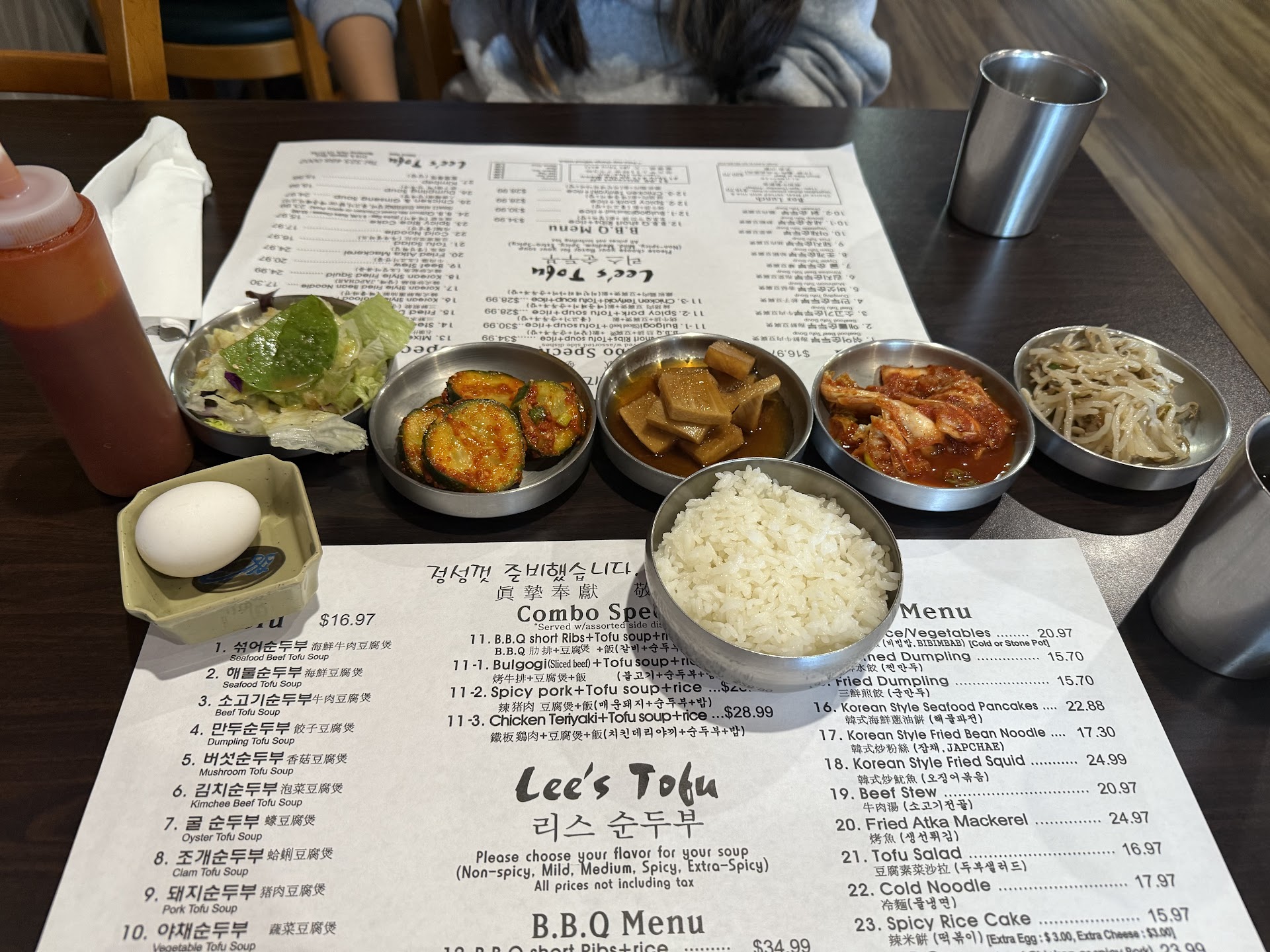 It's possible that Lee's Tofu is the ONLY Korean restaurant in Eastmont and the adjoining areas. Because of this, and the absence of competition, I wasn't expecting much. But it was a great surprise! The tofu stew was rich with ingredients, and the banchans were very good - Standouts were the cucumbers, the napa kimchi, and the marinated boiled potato. The only thing that I would say I missed was fried croaker. If they served fried croaker with the banchans then I would say that Lee's tofu was as good as any place in Koreatown! Extra points for service - Banchans were re-filled without having to ask. I ordered a combo with spicy pork and there was a huge amount of pork served sizzling on a platter, quite spicy and delicious! The interior of the restaurant is fairly plain, similar to BCD tofu in Koreatown, for example. Music was slightly loud for my taste - I'm sure they would have turned it down...