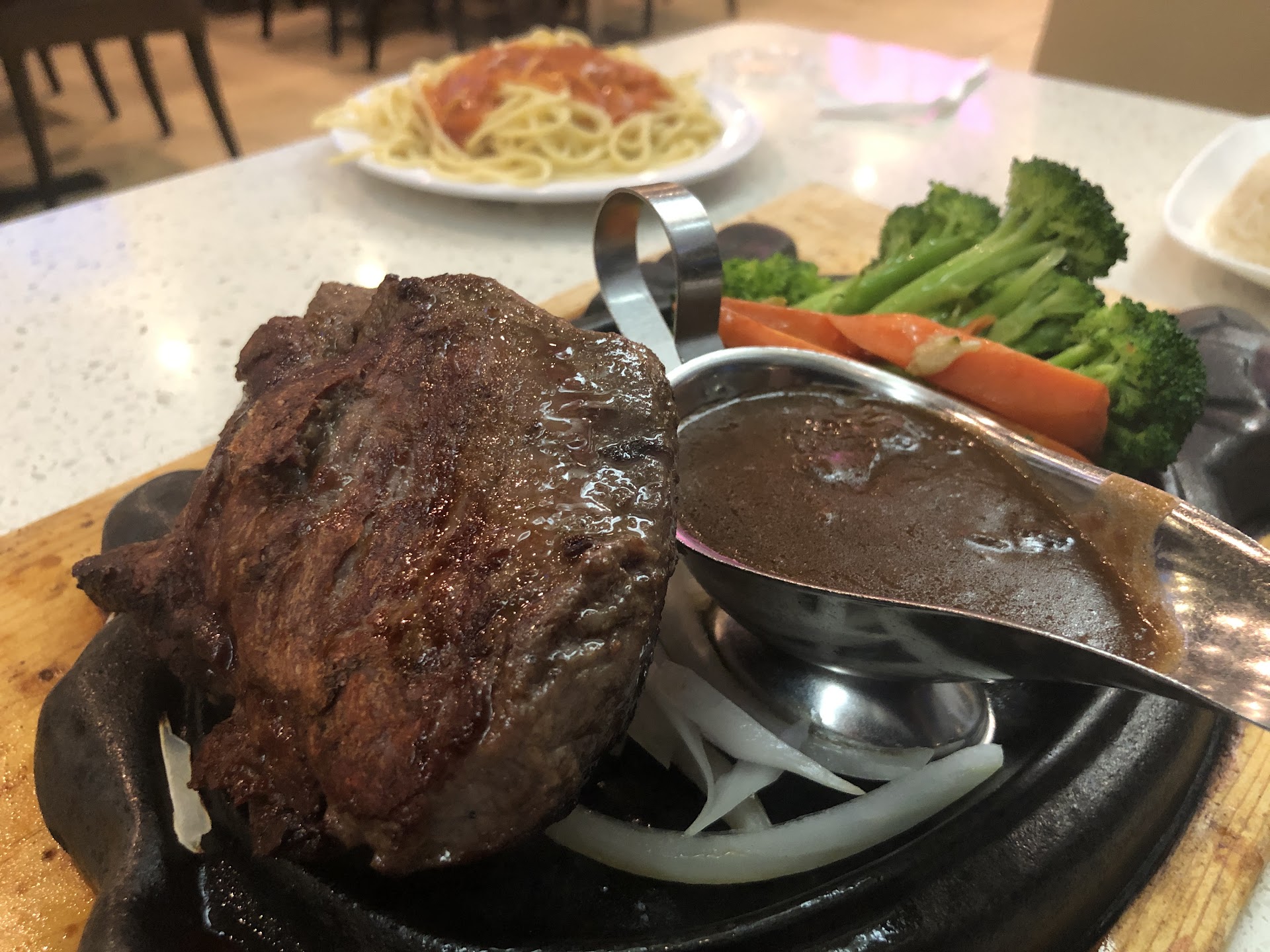 OK Cafe is a Hong Kong style restaurant serving a fairly large menu of both Cantonese dishes (BBQ meats, soups like Wonton and noodles, Beef Chow Fun, Chow Mein, etc) as well as Western style cuisine (steak, pork chops, pasta, egg dishes, etc). It's a combination that is popular in Hong Kong and in the expat community here.