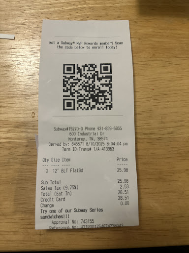 We went to Subway this evening and who was working didn't know what they where doing. We ordered 2 sunrise melts and neither one had egg on them. It is suppose to have egg, one piece of ham, one piece of turkey and 2 pieces of bacon. We got 2 pieces of bacon an 2 pieces meat for a 6 inch sub. The egg is the main meat on the thing and we didn't get it. Imagine eating a thick sub with no meat. One of them had no cheese either. The other one was missing jalapeños and banana pepper but had cheese. Both was suppose to have extra cipotle and barely had any. I love Subway and have been going there for a long time and always get the same sub. Never have I ever eat one so nasty. We paid high prices for a meatless sub. Today is March 28th and subs where bought about 5:00pm. You need to figure out who is working and retrain them because...