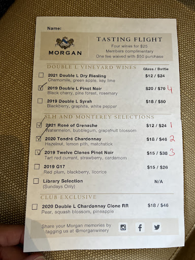 Read moreLove to come here whether with my family or friends. The service is welcoming n the place is so inviting . However this last visit , they ran out of charcuterie . We were looking forward to that accompaniment. I ran to Safeway to get what I needed n had my ever ready picnic bag in my car ; so we enjoyed our tasting. Did not get a full bottle to open b/c we had to be at Roy’s at 6pm. Nothing will ruin our stay whenever we visit Morgan’s. With or without their...