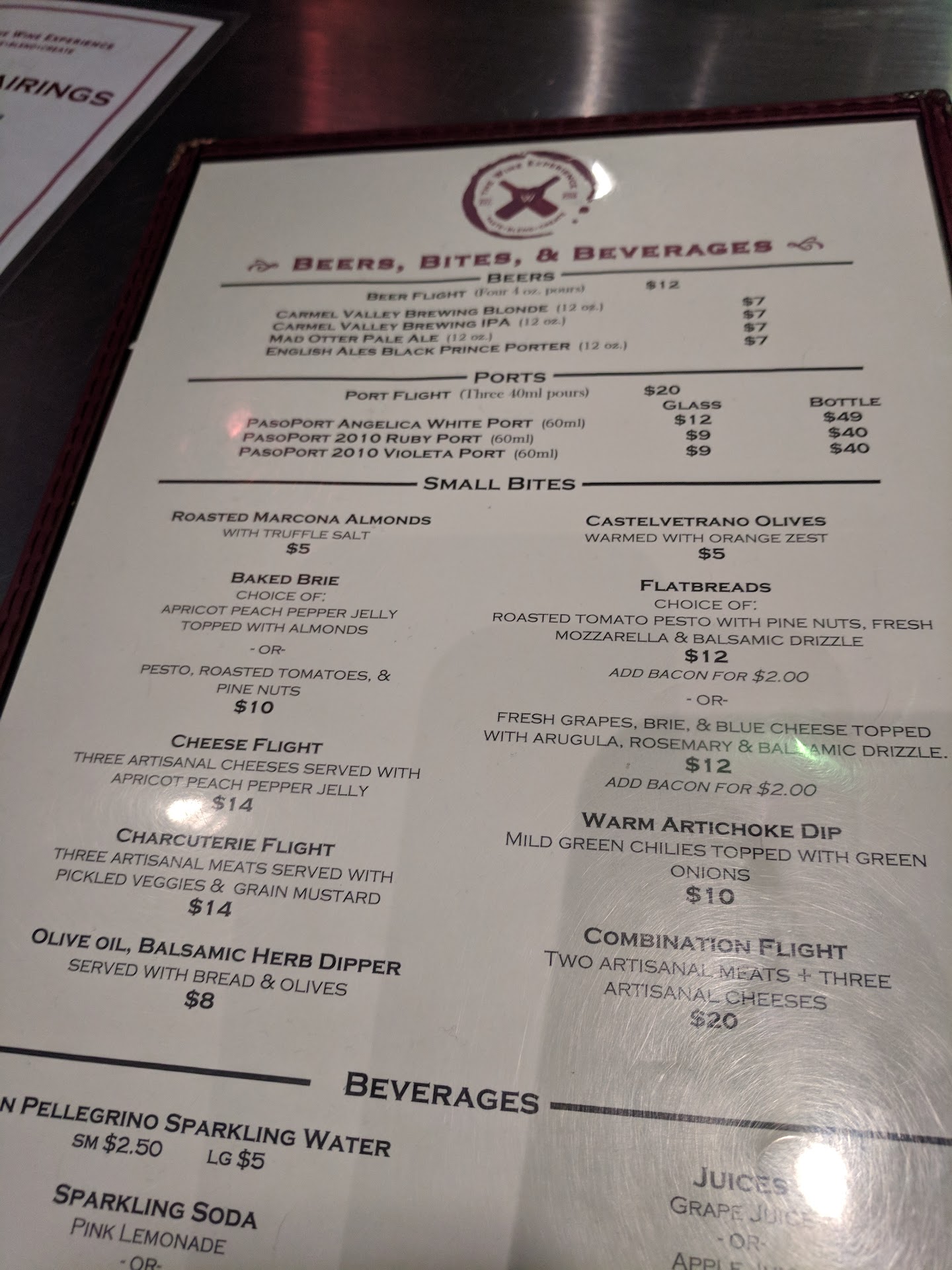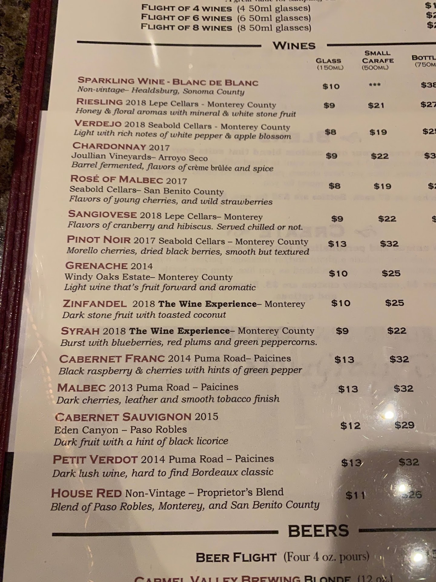 Has some great...and some not so great qualities. On the plus, they have about 15-20 wines to chose from in this nice wine bar in Monterey. We got a flight of 8 wines to try. Some came in glasses others came in test tubes with labels nicely presented. Price was pretty reasonable when compared to what you pay for a glass of wine in a restaurant.