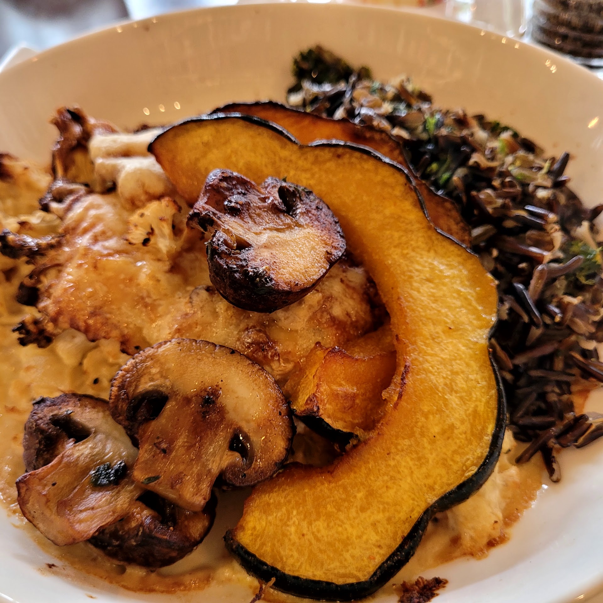 Read moreI wanted to love this place. It's a good concept, but for the price, it falls short. I had the cauliflower gratin with rice for $19! It had 3 halves of a mushroom and 2 very thin slices of roasted pumpkin. The gratin was delicious, but the rice was VERY Al dente (chewy, undercooked) and just tasted .... earthy? Like grass? It just lacked any seasoning or flavor and was disappointing. I had the raspberry lemon cupcake that was small and very dense--not the light, airy cupcakes I prefer, but the flavor was good. Nothing that stood out from any other cupcakes one might buy at a bakery. That's all I had for $24! No drink. So with tip, for lunch, it was $29. For that price, for a vegetarian meal--it screams full service, sit down service. Paying at the counter and having a pitcher of water set on my table to serve myself just seems incongruous with the price. It's a cute place for a cafe with lots of books for sale, but it feels really overpriced for the portions/type of food offered and lack of...