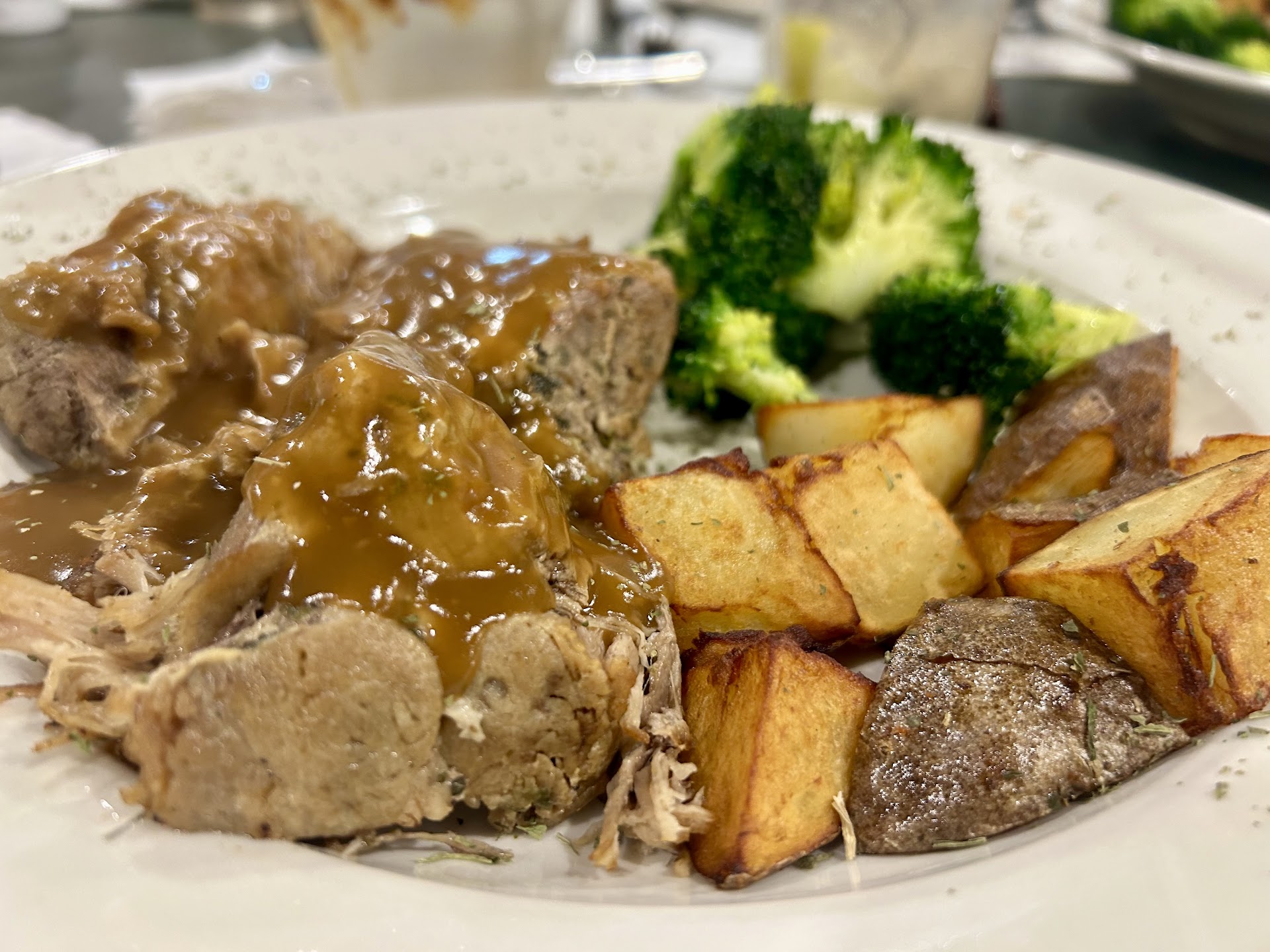 Side salads were romaine lettuce, 3 pieces of tomato, and croutons. Turkey BLT was a good size and had decent flavor. Dessert was enjoyable with caramel apple pie and brownie sundaes. Both served hot which went great with...
