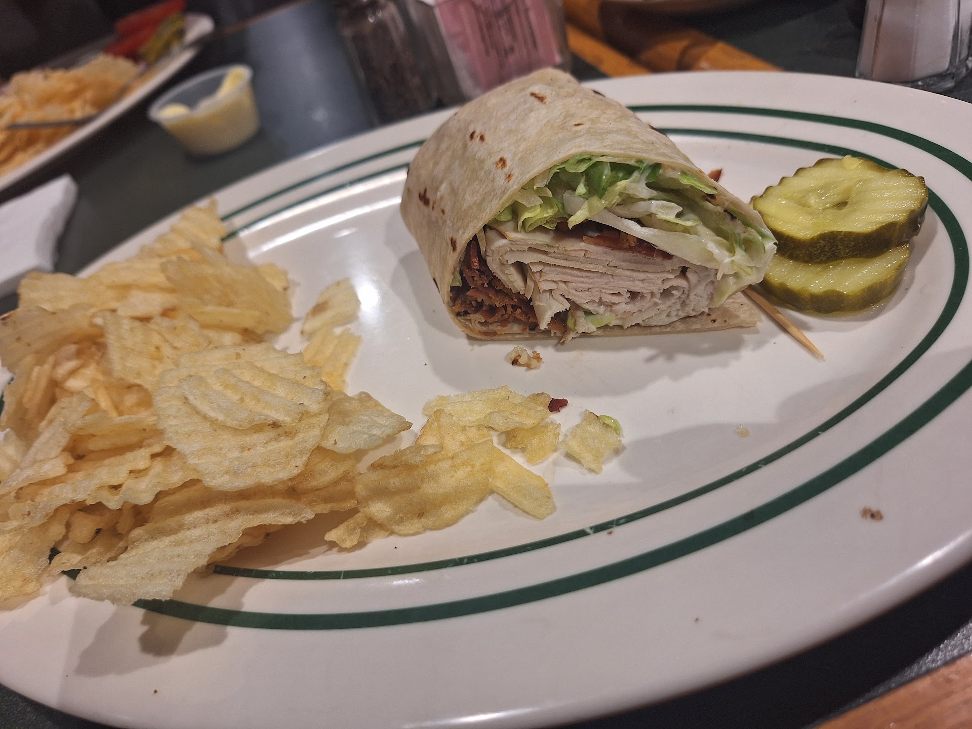 Side salads were romaine lettuce, 3 pieces of tomato, and croutons. Turkey BLT was a good size and had decent flavor. Dessert was enjoyable with caramel apple pie and brownie sundaes. Both served hot which went great with...