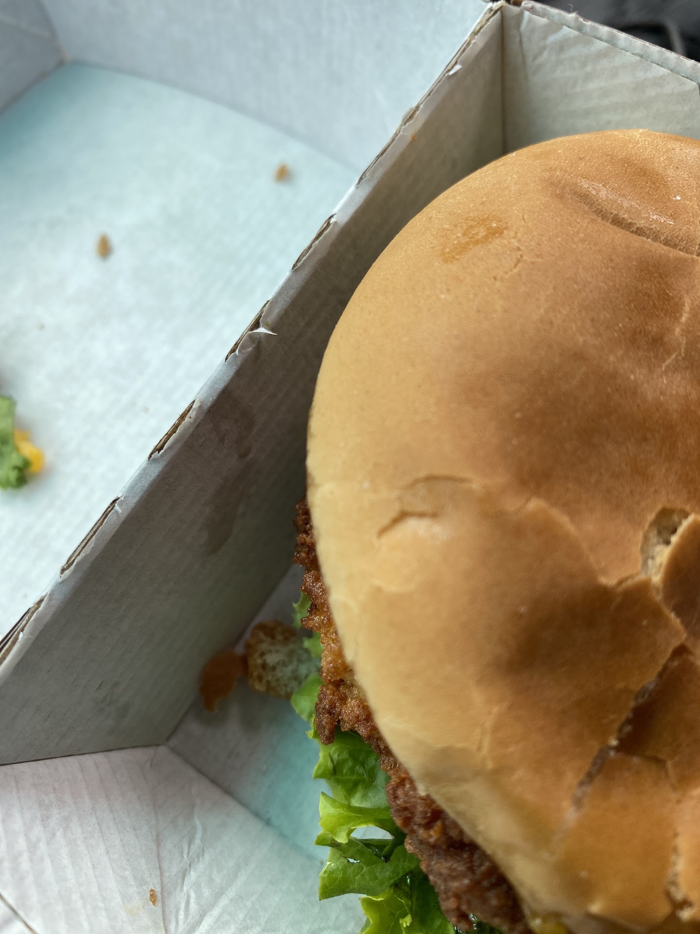 Whatever. So we drove away without our fry. But as we sit down to eat our meal, we also realize they also got our order of the sandwich wrong. (We asked for the tomato on the side and it was still on the sandwich).