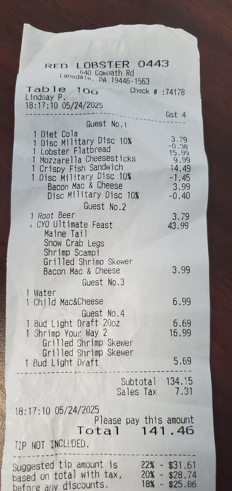 But for goodness sake Red Lobster Managers and Corporate, STAFF YOUR RESTAURANT and TRAIN your bartenders! It's not fair to them to be thrown into the deep end on a holiday with clearly NO experience making drinks.