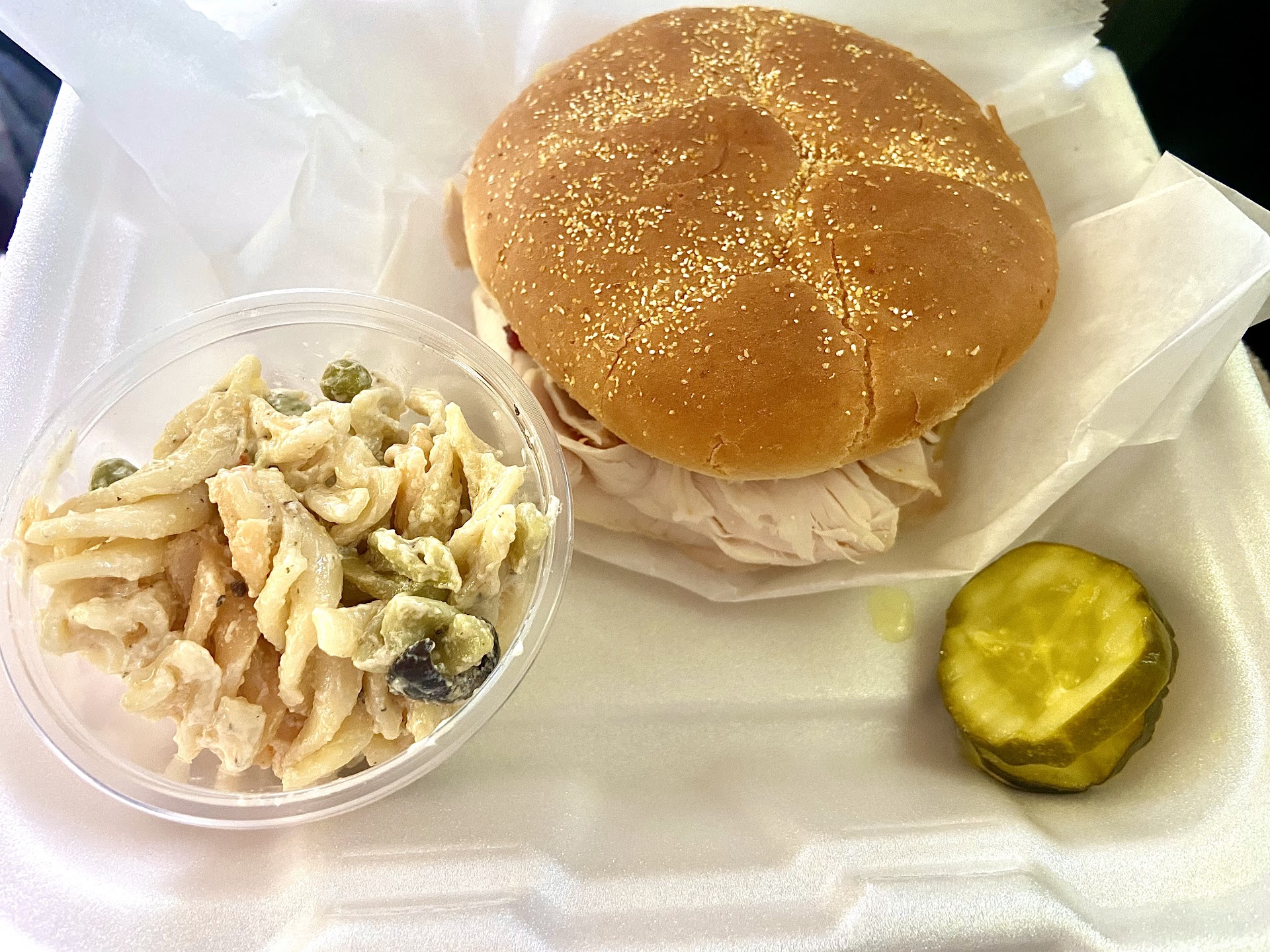 I got the Gobbler sandwich, which has cornbread stuffing and cranberry sauce for a Thanksgiving feel. They have both sandwiches and plates with turkey, which has some of the best roasted, meaty flavor I have ever had in a restaurant turkey! None of the dry, flavorless energy you might imagine for a turkey sandwich! They put a lot of meat on the sandwich, too. The pasta salad was also a standout.