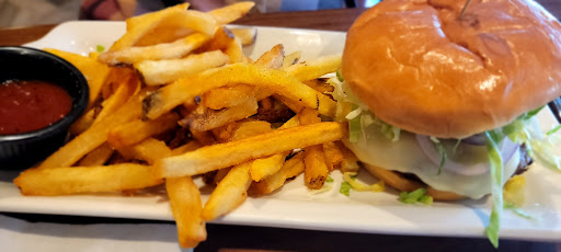 My Gorgonberry Pecan salad was very large and tasted excellent, while my wife’s chili was a bowl (not a cup) and was quite filling in itself but tasted “just ok” since it had an unusual flavor in it that tasted like Lilac bushes smell. My Honey-Chipotle BBQ burger was huge (as in too big) and was extremely sloppy to eat given the Chipotle BBQ sauce and Black Pepper Mayo. The fries were unusual in that they tasted somewhat sweet as if they had both sugar and salt on them - not a fan. My Fudge Brownie dessert would have been excellent had it not been for the strawberry purée that interfered with the chocolate flavor of the brownie and fudge sauce. (I’m a chocolate lover.) My wife’s Peach Bread Pudding was amazing and worth a return trip for that alone. The portion sizes left us uncomfortably stuffed at the end of our 3-course dinners, but there was no way we were going to get our warm desserts with ice cream and whipped cream packed up “to go”.