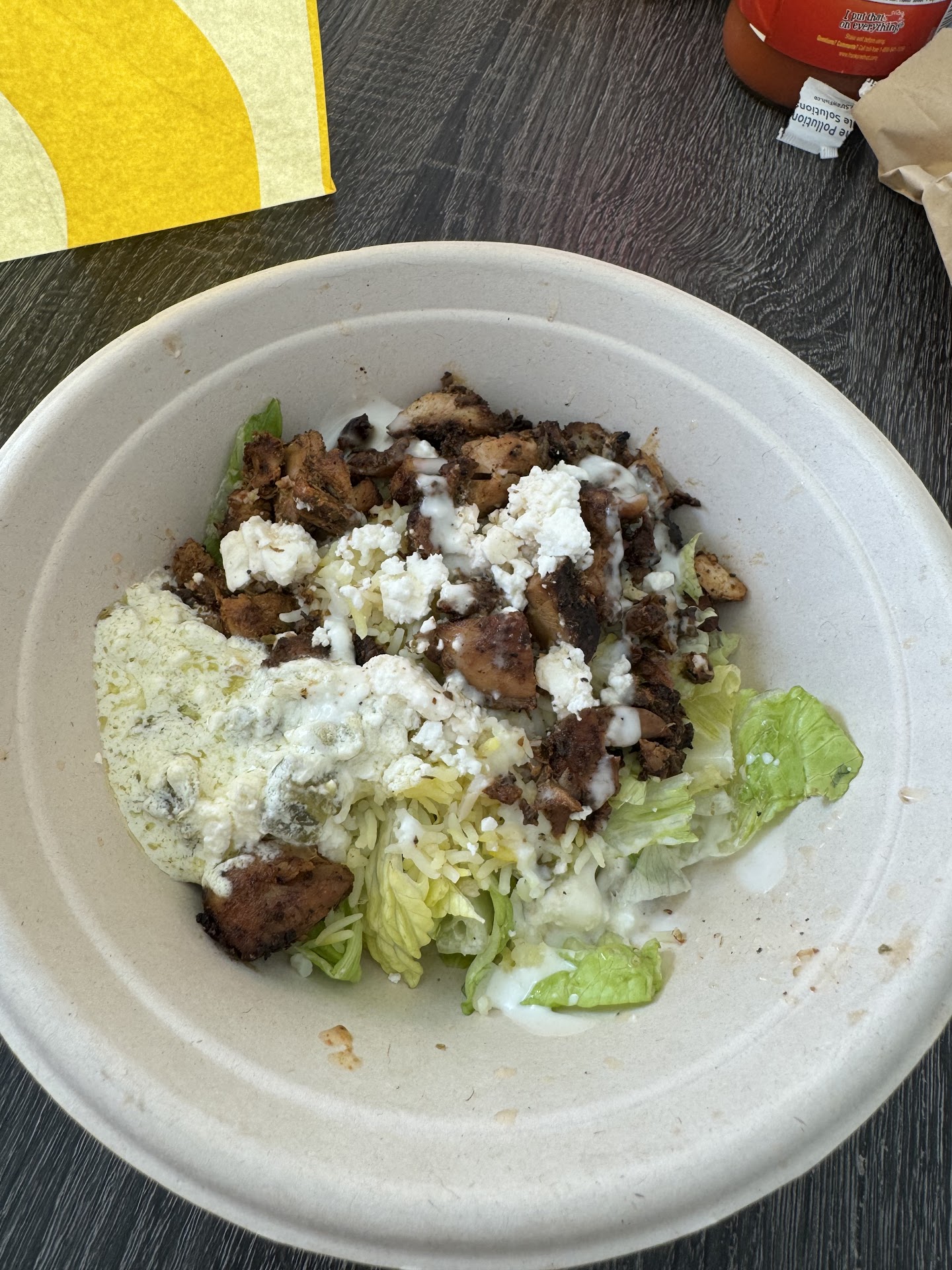 Read moreOrdered online for a drive through pick up order. When we arrived, they told us they didn't have the good ready and had 'just gotten the order'. That was inaccurate as we literally had to wait almost 30min from the time we submitted our order and then actually pulled up to their drive through. Then we waited another 15min for them to prepare the food, walked inside to grab it, and the guy rudely told us he was out of a 'few things', no offer to substitute anything or refund partial money back. When I got home and we started to eat, we noticed the bowl was half full, literally had 3 ingredients in it, so basically everything topping wise I'd ordered was left out, and then there was no meat, which I'd pay an upcharge for the steak and there was none!! I ate a cold, old tasting bowl of dried out lentils, wilted lettuce, and onions. Excuse me, but if they were supposedly out of everything then they should have told customers and at least offered a substitute like a drink or something. I will never return to this location. The cava location I usually go to is way better...