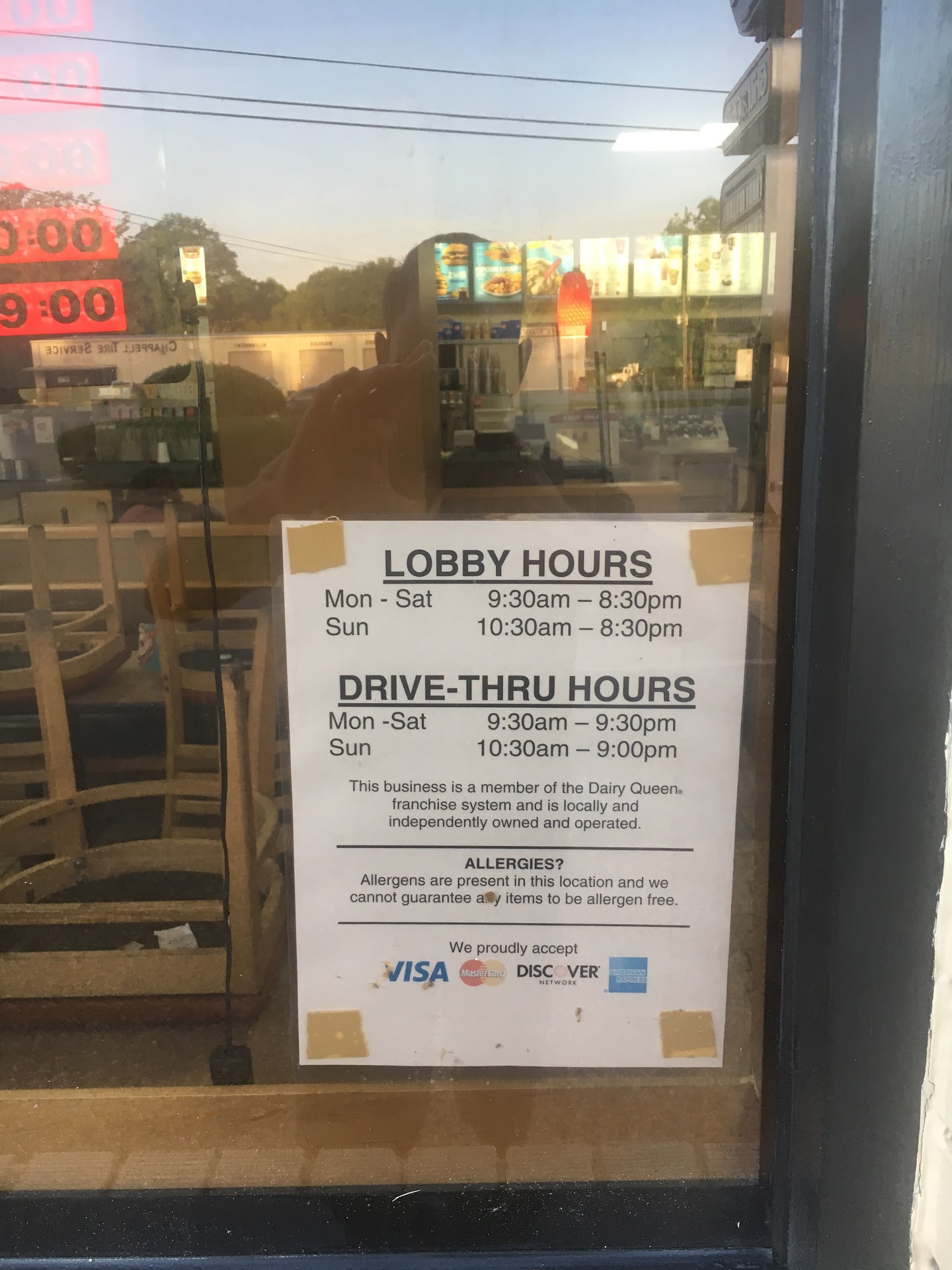 Visited this place because there was absolutely nothing else nearby and my son wanted to go here, because you know, dairy queen is known for their awesome chicken tenders baskets with gravy and sweet treats. Except this place looks like it was forgotten in time and the shipments of chicken and gravy and anything nice had stopped long time ago. There is absolutely nothing nice about this place. DO NOT GO HERE. You will get asked what type of sauce you want for your chicken tenders, and when you point out it should come with gravy, you will get told it doesnt and will get offered ketchup. You will also get a cone that has about one inch of ice cream on it, nothing else. My dog didnt even want to eat the fries (she loves fries) that's how bad it was. If you are traveling and hungry and have hungry kids in your car for what seems an eternity, go somewhere else, it will not be worth it Sharon, trust me. Now if you live here and you actually choose to go here, I cant help you there, just know you could do much better, much,...