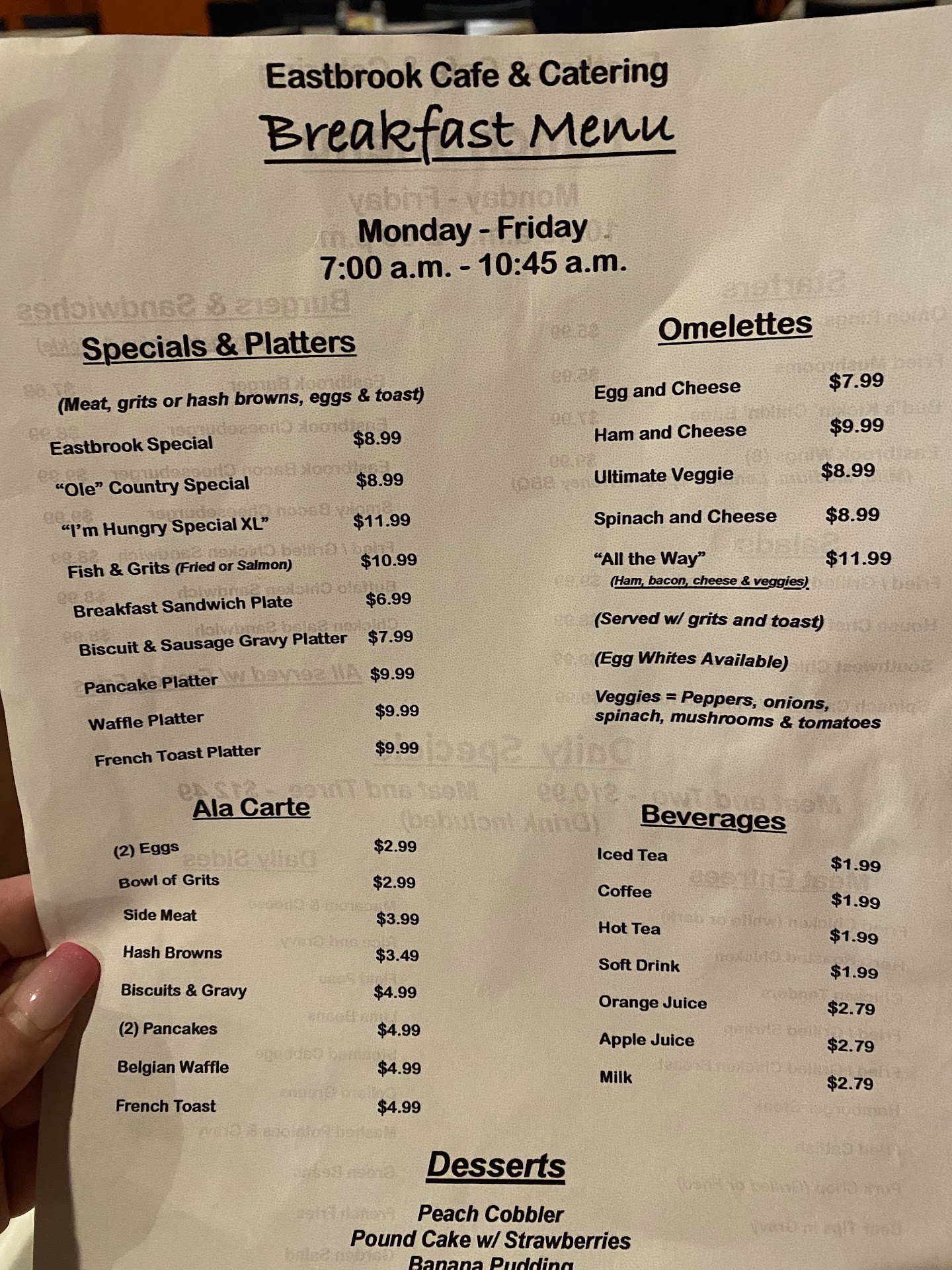 Great dumplings...not much chicken. Had group of about 30 & they did pretty well with this large group. My sides were ok, but not hot by the time I got them. Great, warm peach cobbler. Others said really good friend chicken, friend catfish v& country...