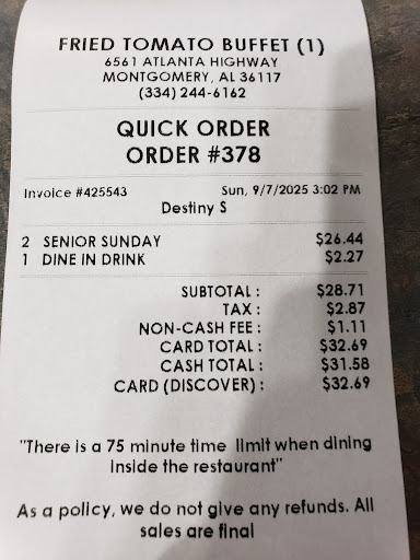Overall Impressions: Bring your family and enjoy the food! My first experience wasn't the best and may just be an isolated incident. Nevertheless, each time I come I get what's expected and some. This is the best buffet place in Montgomery, AL. Ill update when Fried Tomatoes takes a loss.
