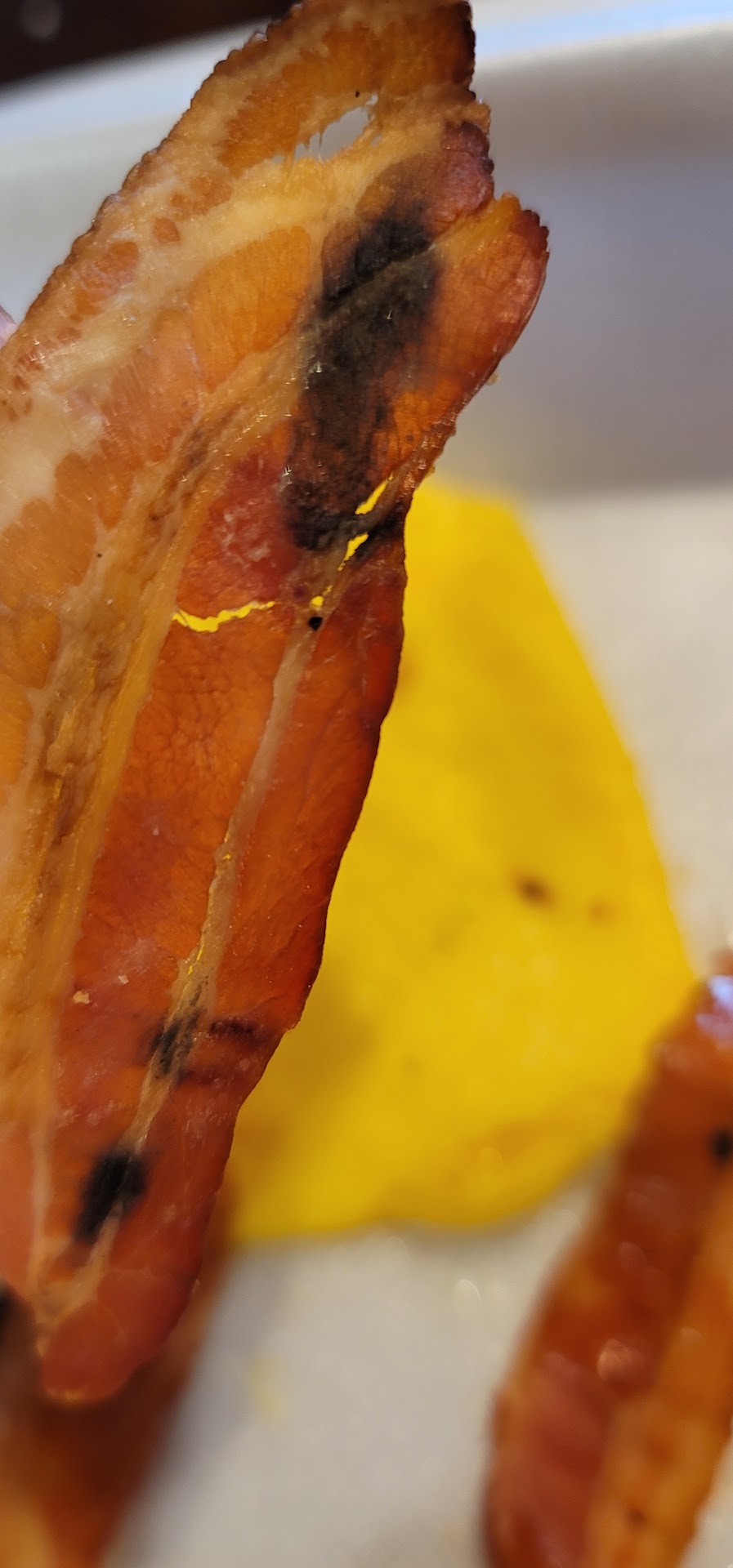 Beware of unsafe food and check your food before you leave! Purchased breakfast during morning rush only to reach destination and see inside the styrofoam to-go plate two paper thin strips of bacon with black stuff on it. It was not burnt. It appears to be mold! Items were also missing from the order that were on the paid receipt (hash browns and extra bacon). I have taken photos of the bacon so this can be reported to the appropriate authorities. This is unacceptable and a major health risk and concern. This is not the first time something has been wrong with an order. In the past I have had to pick at the food and throw half of it away and did so without bothering to ask for a refund or bringing it back. I shrugged it off that it was cheap, fast food and not a high quality restaurant. But MOLD?! UNACCEPTABLE!!!