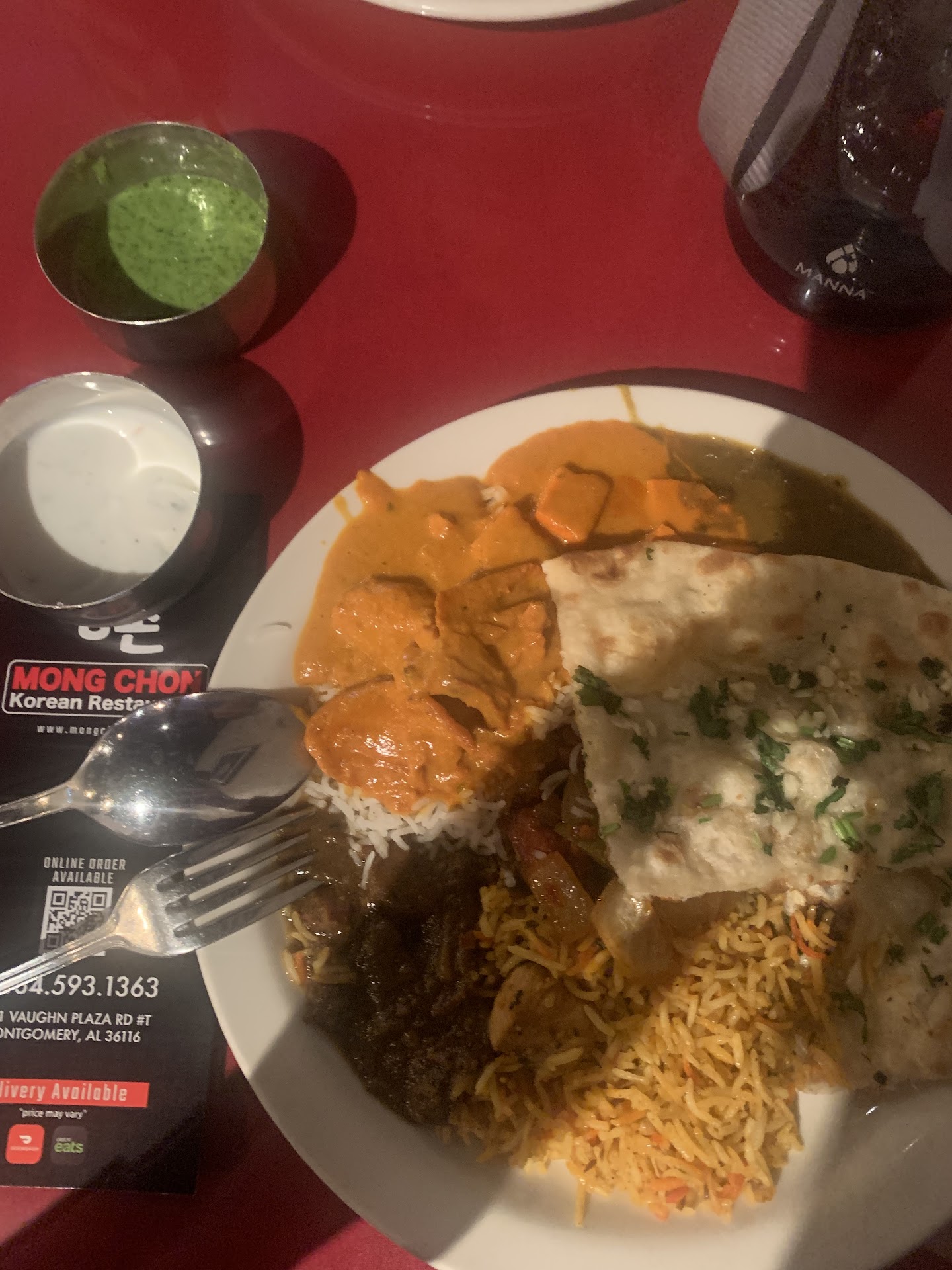 I've been to India Palace for dinner at least 3 times now, and every time I go I kick myself for not eating there more often. The food is just....awesome. Everything I've had there has been incredibly flavorful and well-presented in their unique serving dishes. I got the Kadai Paneer, and my wife got one of the lamb dishes. Both were excellent. We also ordered fresh-baked naan bread as an appetizer which was delicious. The service was great, and our food came out in a timely manner and was nice and hot (served with rice on the side). Speaking of hot, they asked us each how spicy we wanted our dishes on a scale of 1-10. I said 4 and my wife said 2, but they seemed to be about the same spiciness level to us. We were both fine with the spiciness level. I suggest starting on the low end and then work your way up once you're familiar with how they spice up their food. It was more than enough to fill us up, and we had leftovers for lunch the next day. I've never been to their lunch buffet, but I imagine it's really good as well. We both had dinner with an appetizer for under $40 including tip, so it's definitely a good value. India Palace is just so different from other restaurant options in Montgomery. It's one of the...