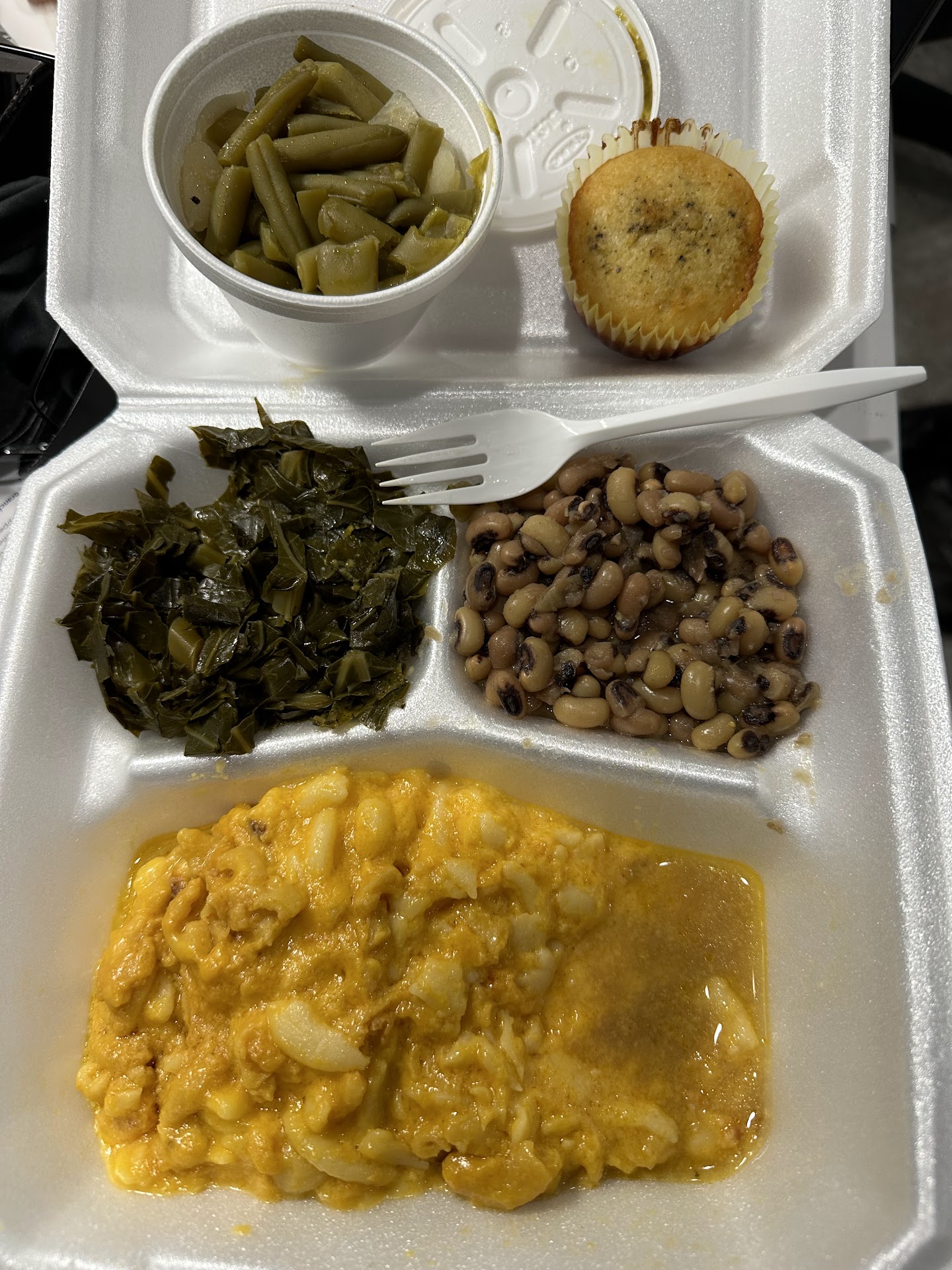 Ā Ā Ā Read moreWell, let me tell you about this place⦠Great menu, priced reasonably, food is fairly decent. I usually order a vegetable plate, at least thatās been my āgo toā over my last 3 or 4 visits and itās been very satisfying. The greens are seasoned very well, even with a few more stems than Iām used to but the flavor supersedes that. The black eyed peas make me want to order them by the pot!! The green beans are also well seasoned with plenty of white potatoes and onions. HOWEVER, recently they seemed to have switched up on whoās cooking the macaroni and cheese (a big deal in the culture). I ordered my usual and got home and opened my tray to thisā¦ ššš Of course, I didnāt even attempt to eat that Mac⦠I still loved my other sides and even the cornbread (which is usually a little too āfirmā for my tastes). Just a heads up folks, check your food before you leave to save you some time and anguish. And to J.W. Beverette, standard Mac and Cheese is what weāre looking for, all that extra stuff (velveeta, ricotta, pie crust, raisins, etc.) those other folks putting in the Mac and Cheese these days, let that stay over there with them⦠Please...