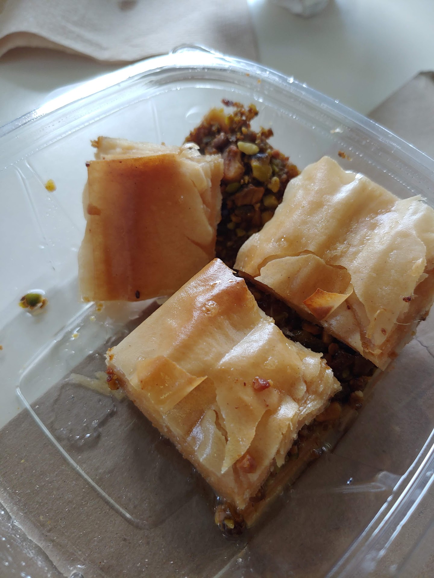 We tried the chicken gyro and the lamb gyro as well as falafe to go with the hummus and babaganouch. (It was out only dinner of the day!). The gyros were great. I'm not sure how they prepare than meat. I'm guessing maybe it's on rotisserie in the back. But I'm not sure. It did have that crispy Char on the outside that implies it would be on a spit type thing. All I can tell you this fabulous served as typical gyros are- lettuce, and onion, and a sour cream cucumber sauce.