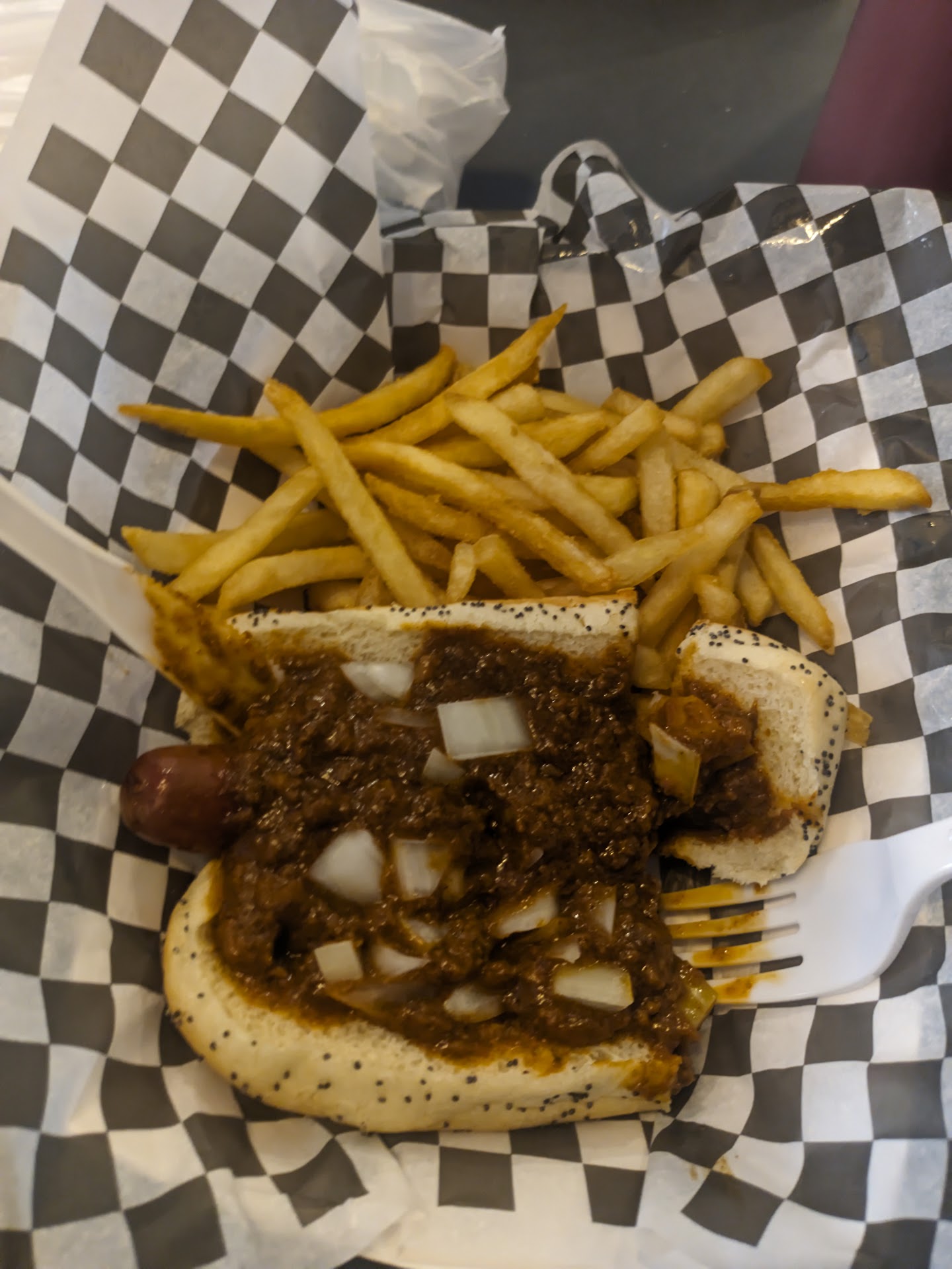 I ordered 2 chili dogs (one to eat and one to go for my husband) and an order of fries. I was not expecting the poppy seed bun, so it was a surprise to me but even though I don't like them, this was a good addition to the taste of the dog. I also wasn't expecting onions (maybe I didn't read the menu close enough haha) but they were very fresh!