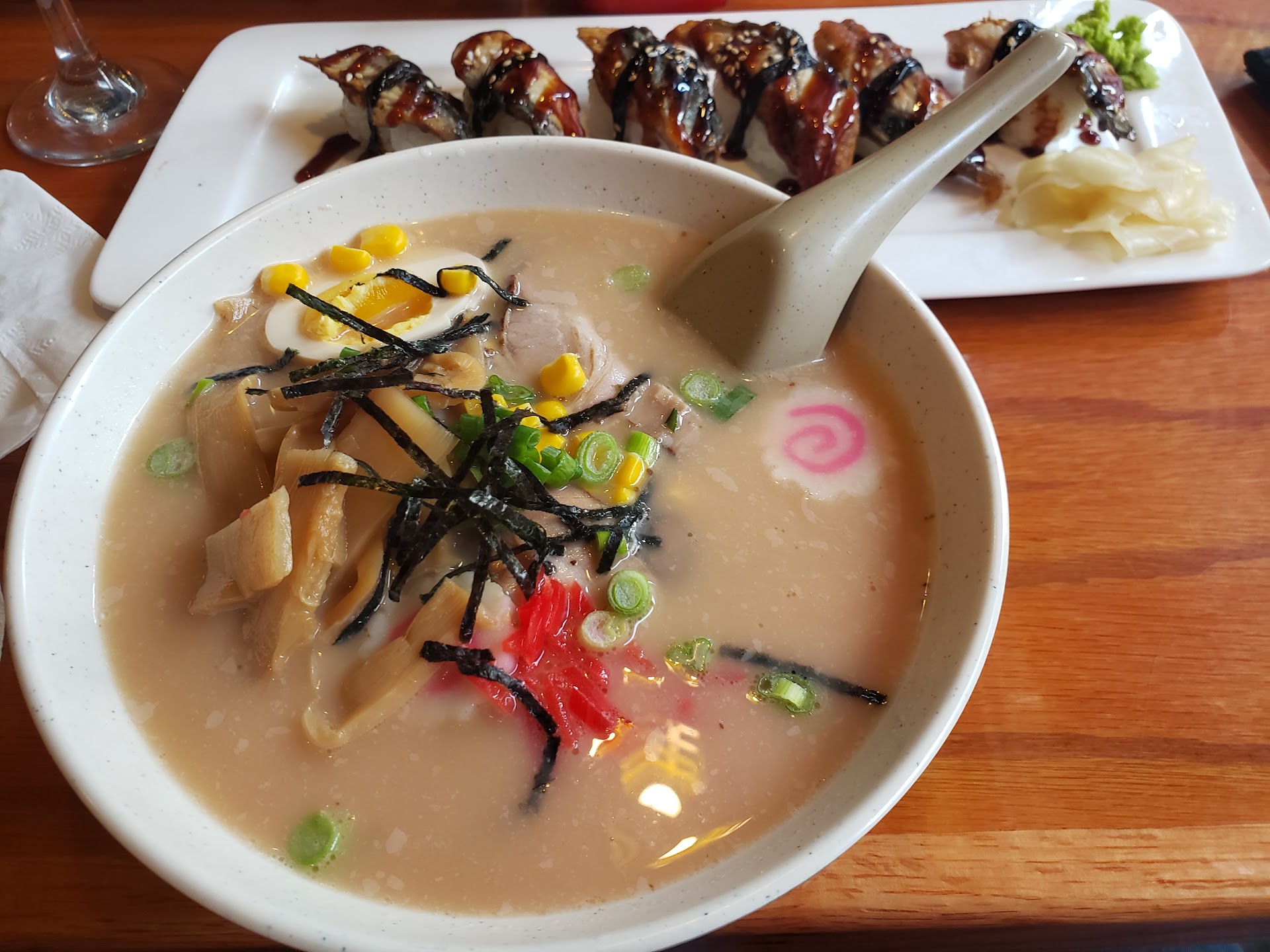 Just discovered the place today! Tonkatsu ramen is delicious. The pork in it is super tasty, some of the best I've had. Eel sushi is great, of course, and the cheese wontons were also surprisingly good! Looking forward to coming back and trying something new ... maybe the sea urchin and quail egg, if they can get it in!