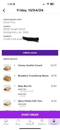 I always order using the app so my food is supposed to be ready when i get there but I'm told every time to pull into the parking spot and they then make my food and bring it to me 5-10min later and even then when it is supposedly just made its COLD or only slightly warm. Not to mention about 65-70% of the time my order is made wrong! I considered giving 3 stars as opposed to 2 stars HOWEVER with the being a taco bell not much further away (the one in Eastchase) which I will give 5 stars to, it just makes this location so much worse when the other is better in every aspect other than being a bit further away. That being said at Eastchase I still have to wait even when I order with the app but at least there I'm only waiting 2-3 minutes as opposed to 5-10 minutes. It's a shame Taco Bell is one of my favorite places to eat but this location has really...