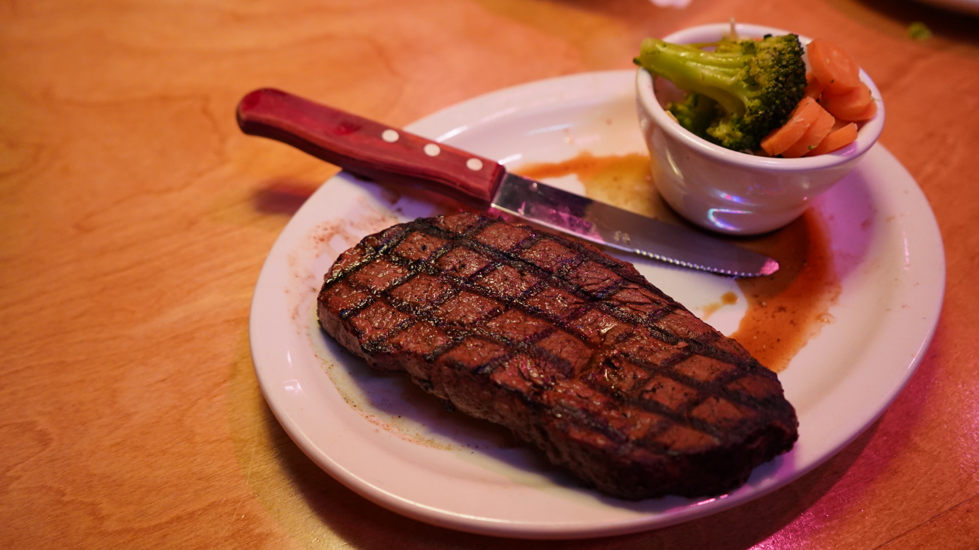 Main Dish STEAK (biggest they had) Pros Cooked well done! Nice size