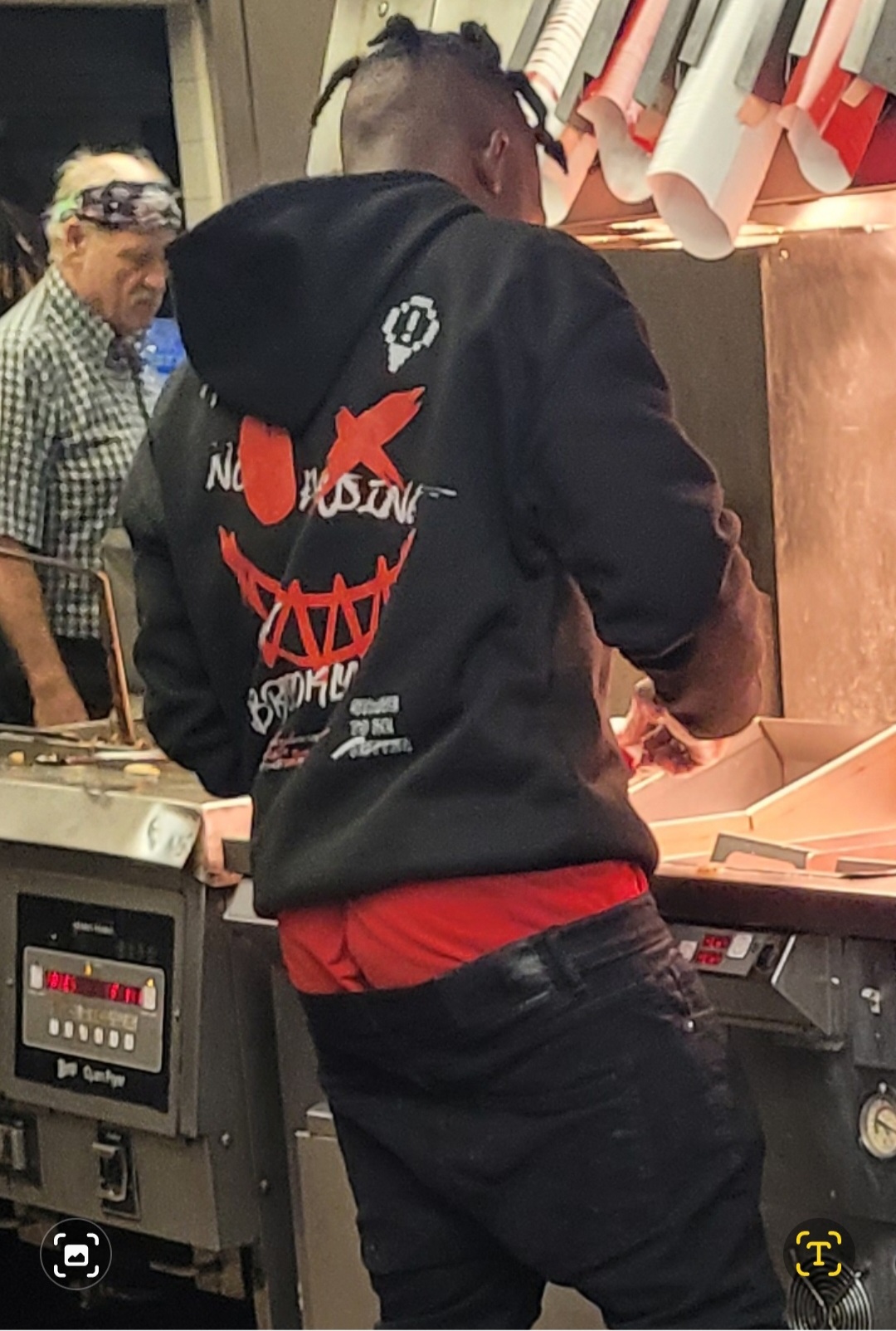 Here is a young black male working in the kitchen french fry area with his pants sagging so low off his azz that he had to keep pulling them up every 30 seconds.