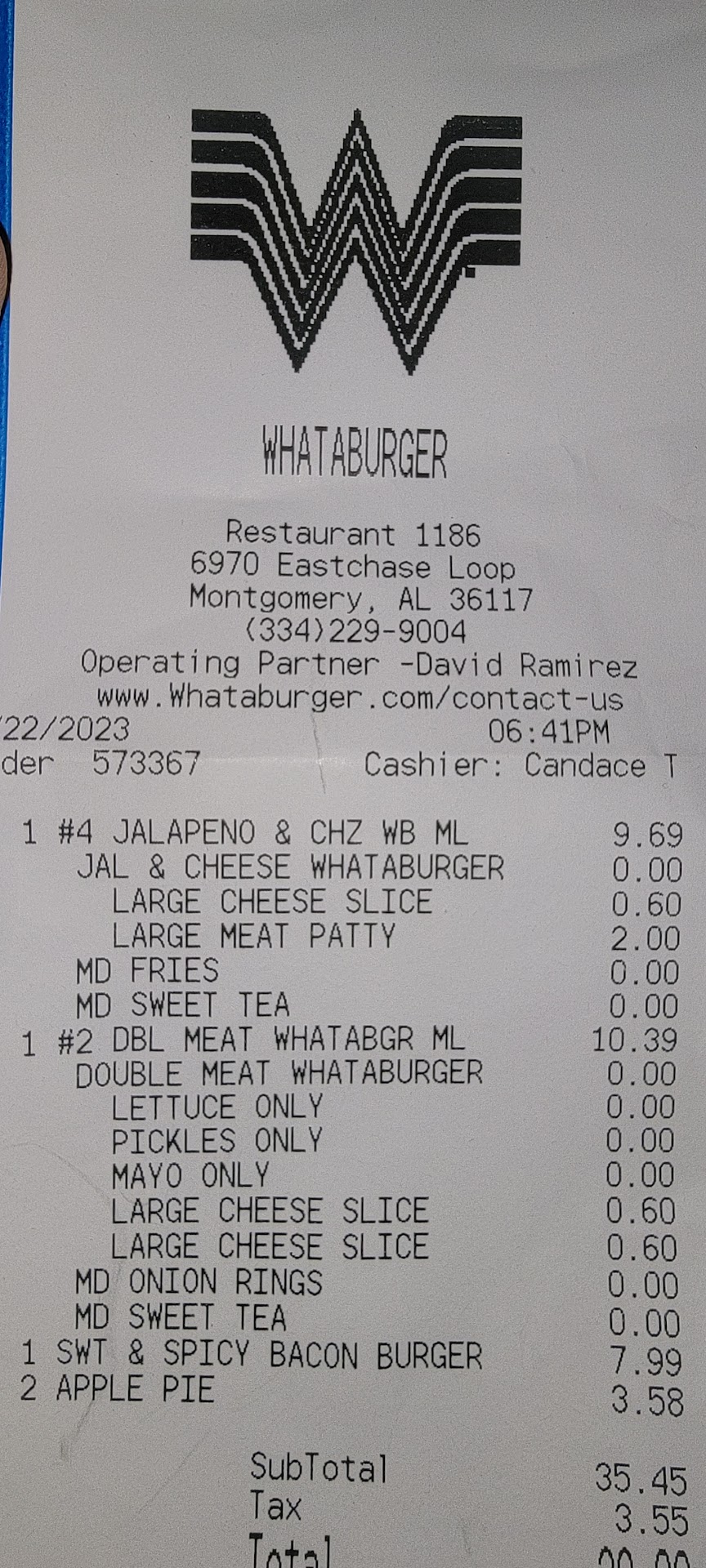 Every single item on my order was messed up. (Except the apple pies). For instance... I ordered extra meat patty on jalapeƱo burger (#4)...did not receive. Also extra cheese...not granted. My French fries tasted great. But who ever packed them made sure to pit them upside down in the bag! On the next burger we asked mayo,pickles and lettuce only. I stead received ONLY tomatoes! Also ordered add cheese. Only one burger had cheese. Yet was charged for 2 extra cheese. The 3rd hand burger was great....if it was what I ordered... BUT WASNT. I PAYED FOR A SWT AND SPICY BACON BURGER. all I got was a burger w no bacon. Lastly...something was wrong with the 2 teas. I usually can drink the hole cup. But it tasted like cigarette ash. And my coworker also agreed that there was something wrong w flavor. Ashy. Gross. WHATABURGER has always been my favorite place to get real beef and the taste of texas as I call it. As I grew up in texas and right down the road in corpus christ tx. And have dined at their first diner and proud to see the food chain spreading throughout the country. I travel all over with my job. Litterly have never had a mistake at a wataburger with my orders ever since I was a child. So, I won't stop being loyal. But my order last night made me realize whoever took my order or made my food must have just not listened or cared enough to do it right.
