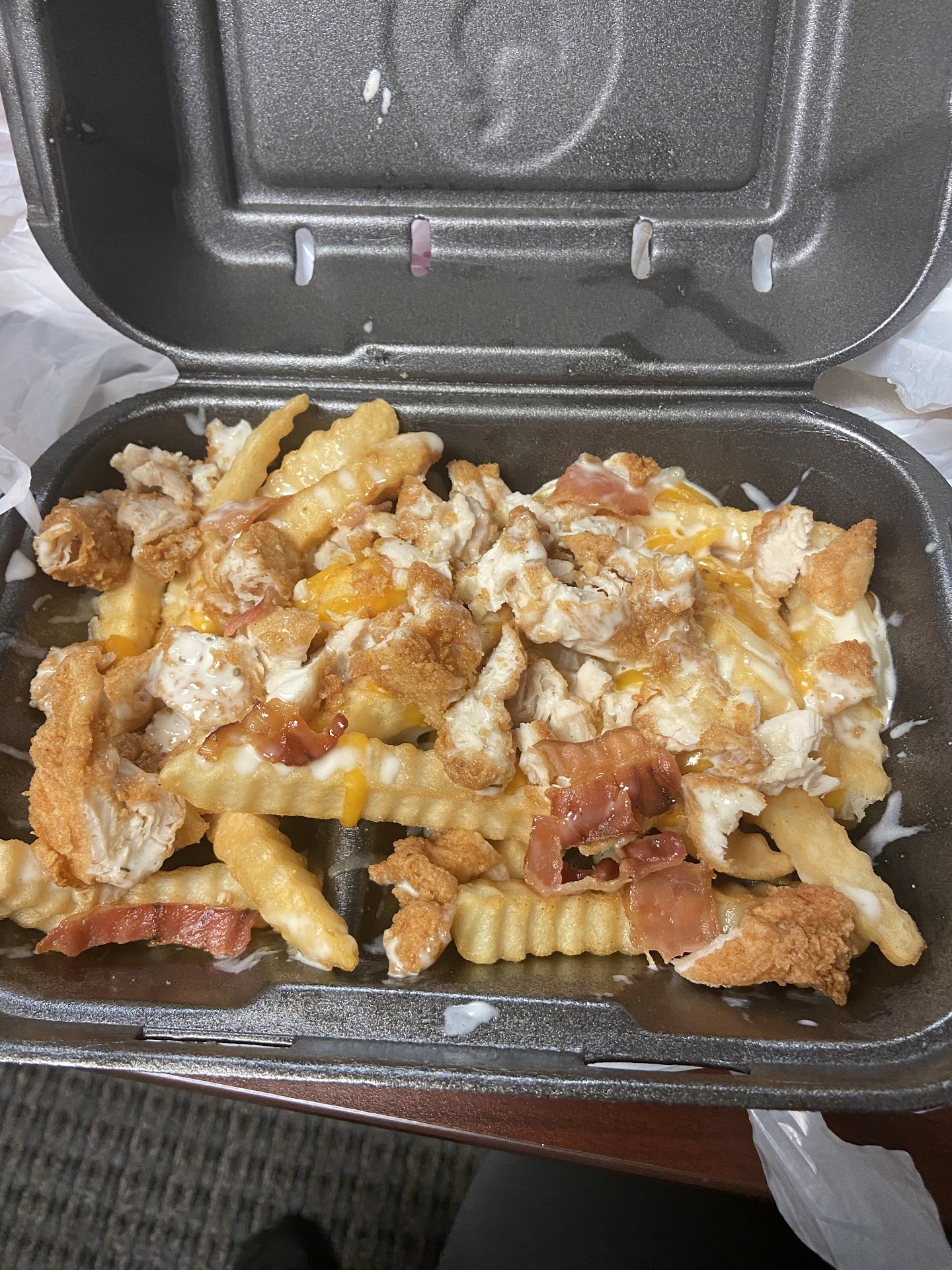 We sat there for a few minutes, they brought the food to the window. The manager flings the bag out the window again and says have a nice night then walked away. We opened the boxes, the fries were fresh, but the chicken still wasnt. It was as though they put the old chicken back in the box.