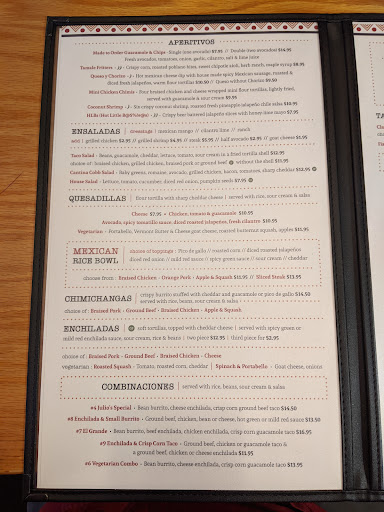There is a bar with about six seats. They have nightly specials written on a chalk board. They play non Spanish music that doesn't go with the ambiance. There is Free street parking at night. They have outdoor and indoor seating. Overall, it was good American style Mexican...