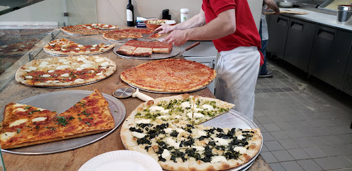 First time here, ordered two plain slices, pizza was okay. The cheese flavor was overwhelming, almost no sauce, crispy bottom. An ok slice of pizza but not great. I also noticed after pies on display were finished the empty spots were being filled in with pizza that was NOT fresh, looks like the replacement pies were made in the morning, or refrigerated. That kind of irked me as well, you should have fresh pies on display, not pies that were made 6 hours ago. Besides that, I couldn't really tell who worked here. There was 3 young men either sitting or walking around the dining room area of the pizzeria. One nodded at me, but didnt welcome me. So I just headed to the register until someone wrapped around it to help me. Service was super fast, but no smiling or interaction with the...