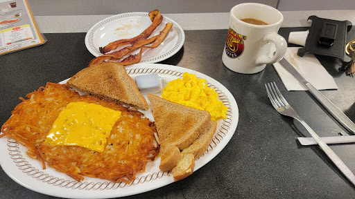Had to fuel up was at a military burial service with mom, since it was a hour drive grabbed something to eat, I haven't been to a Waffle House in awhile, we decided for a booth, We sat in Wanda's area she had us wait for a second to wipe the table & seating off which were really appreciated, she introduced herself & greeted us with a lovely smile & made us feel so welcomed. Sheer got our drink order coffee for mom & water for me, she gave us ample time to look over the menu which mon just got the 2 eggs city ham, hash w/onions & white toast I had the same minus onions but add the waffle.