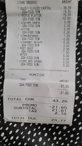 Read moreWe arrived on a Very slow Monday night while traveling. It took us 10 minutes to get seated. Another 5 minutes for the waiter to come by. The young fella seemed displeased we were there with his curt mannerism and understated tone. There were 2 guests at our table and it appeared the waiter had only 2 other 2 top tables. He never asked if we wanted appetizers, spoke about specials, asked if we wanted anything from the bar, questions about the menu, etc. We ordered our food. 2 Steaks, 2 sides each, a tea, a water. Both Steaks were overcooked. My okra was well overcooked and mostly unedible. He never checked back on us as he walked past our table 4 times. The 5th time we asked for rolls again, which we weren't offered prior, and we asked for refills. Our salad plates remained at our table the entire time. We asked a total of 3 times for refills and rolls. He came back some time later and asked if it was ranch we needed? We finished our meals, we never received a single beverage refill and he finally attempted to bring us rolls, but it was after we had already finished our meal, near the same time he brought our bill. What happened to managers or leadership being integrated into the service process? Not once did we see anyone other than the busser and an additional waitress. Restaurants we frequent usually have staff that comes by just to see how things are! Oh, and the icing.....the pen he handed us leaked ink as we attempted to use it! Ink got on our hands and the table. Steer clear of this restaurant until they can get a decent leader to right the ship!!! "There are no bad teams, only...