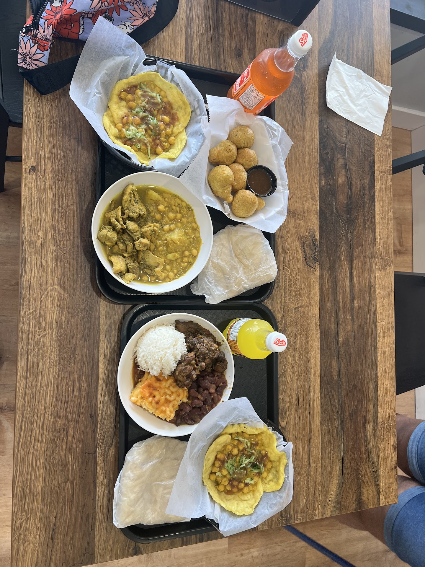 The chicken curry- SO FLAVORFUL. These meals weigh about 2 lbs and are going to feed me all weekend. The curry has chickpeas and rice. Stewed chicken-AMAZING. Comes with red beans, rice, and macaroni & cheese bake. LIFE CHANGING. BussUpShut Roti skin- Perfect partner to these main dishes! Use it to scoop up the food and seal that bite with a present of love for your tongue. Pholourie- Never heard of her and I'm so glad we crossed paths. Fried dough balls commonly eaten as a snack with the tangiest tamarind sauce to dip them in. CHEFS KISS Sorrel- PARTY IN THE MOUTH 🎉 A hibiscus drink that is SWEET and just lovely! Absolutely refreshing. Solo soda is available in numerous flavors as well and the banana is DEVINE.