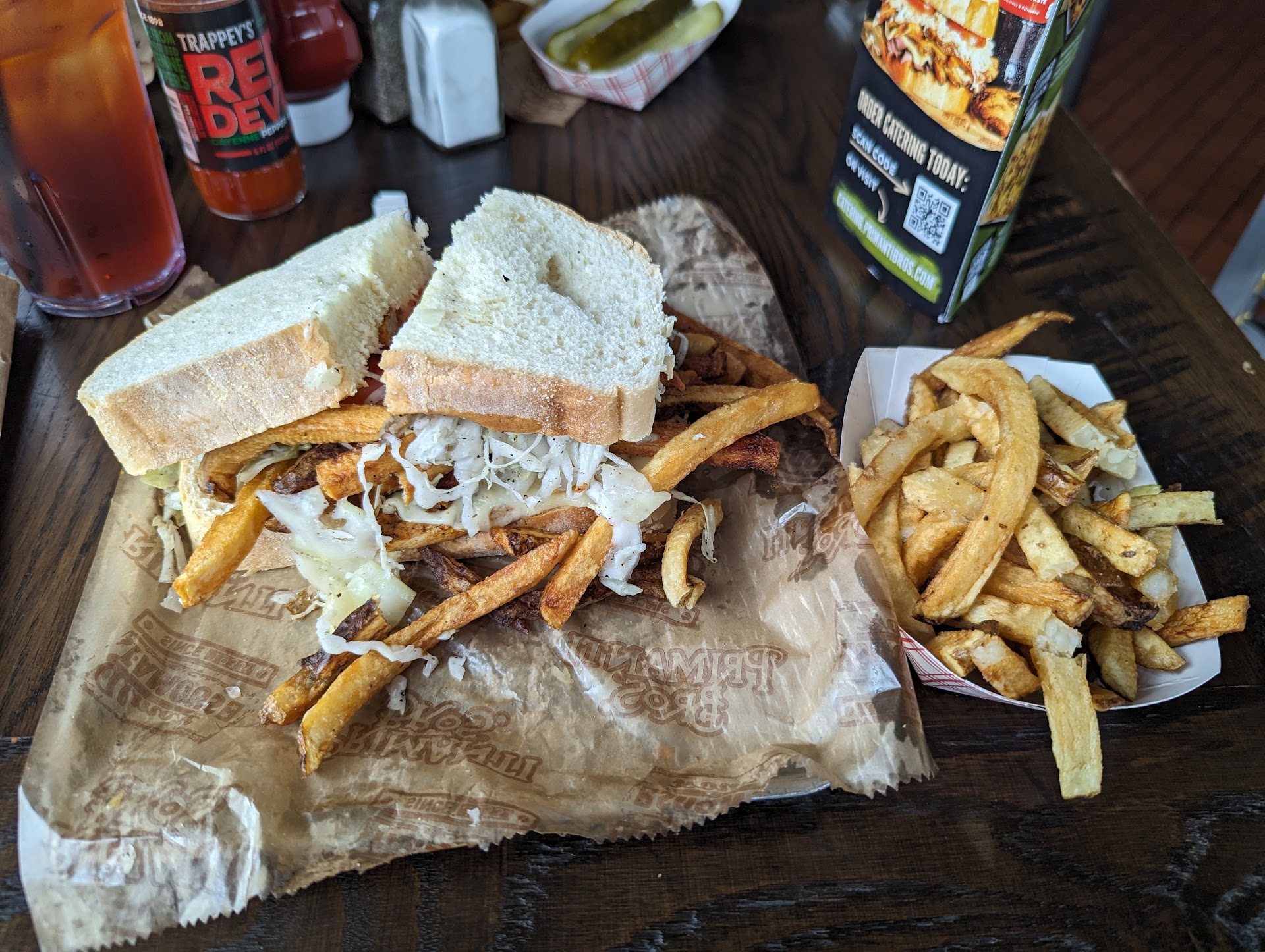 The sandwich I received, a reuben, was decent, but poorly put together, and unbalanced, too much slaw, too few fries, meat lumped in the middle, and just a squirt of sauce. It was warm-ish, but not a hot sandwich. It used a sweet horseradish sauce which was different, and ok, but slaw is no substitute for sauerkraut. Also a pretty big miss because I ordered the original, but was so hungry I just went with it since I enjoy a reuben.