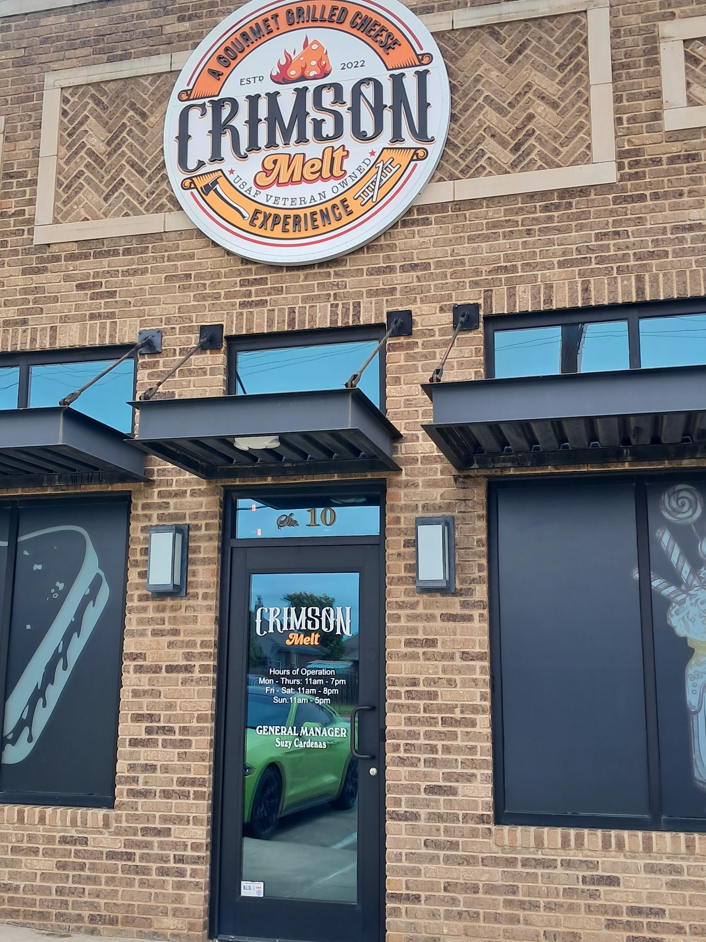 Read moreI had to make a trip to OKC a few weeks ago, and wanted to try a sandwich shop I recalled seeing the OKC Cake Lady's post on Facebook where she baked a special "grilled cheese sandwich-looking cake" for their grand opening. Couldn't remember the name, so I checked her posts and discovered it is called "Crimson Melt." I Googled directions and headed to Moore for lunch. The restaurant takes up 2 suites in the "strip mall;" the main entrance is to the left. Once inside, you proceed to the counter (to the left, toward the back and place your order. I chose to "build my own" sandwich from the menu options: garlic/basil/parmesan sourdough bread, smoked gouda and Swiss cheese, grilled chicken, caramelized onions, and avocado spread....😋😋😋 I definitely also wanted to try a milkshake, and followed the counter person's recommendation of the "Union Break," which is a coffee ice cream base, with lots of whipped cream, chocolate sprinkles, caramel drizzle, little donuts, and a honey bun! At the offer of "$5 more makes it a meal deal," I opted for THAT; it included tater tots and a drink(fountain drink, NOT the milkshake - that was an additional $7.99 for the 12 oz. size). Could I finish it all? I could not.🤣 What a great meal, though! I had the opportunity to chat with Suzy Cardenas, the manager; it was pointed out to me by staff that the owner, Ashontay Owens, was there in the dining room meeting with Suzy and another person. I learned he is both a military veteran (Air Force), as well as a retired fire chief! They've been open about 3 months now and are still in the process of "tweaking things" to give the best possible experience for their customers. The restaurant is completely firefighter-themed, even in the bathroom, with the clever use of pressure gauges and pipes for the toilet tissue holder! This place is absolutely worth a side trip when in OKC area, instead of hitting up the run-of-the-mill restaurants along I-40! I felt the prices were super reasonable for the great food and absolute work of art milkshakes! If you plan on going during "peak" hours, there can sometimes be a 30-45 minute wait for a table, but you can choose to get your food "to-go" if you're not able to wait for seating. I went around 1:30 p.m. and had my...