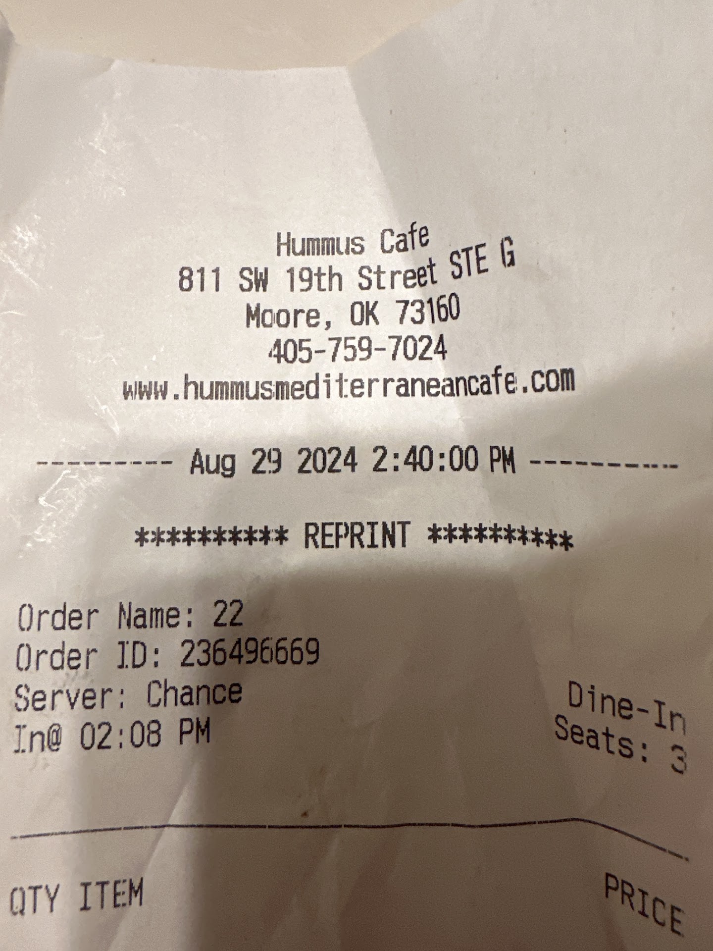My husband had roasted half chicken. Good portion, good flavor, but REALLY dry. I mean PARCHED. We're talkin, fresh out of the Sahara. I had falafel. I have eaten lots of falafel because I don't eat red meat, and frankly, it's hard to get it wrong. When it's this bad, I can only think that it was old, and reheated for my sandwich. Again, too dry. The pita with melted cheese that we ordered was good, though. But not enough to cause us to be so distracted that we didn't see the owner come in. He mosied in, oblivious to us, had repairs going on. Didn't greet us. I don't think he cared if we were there or not.