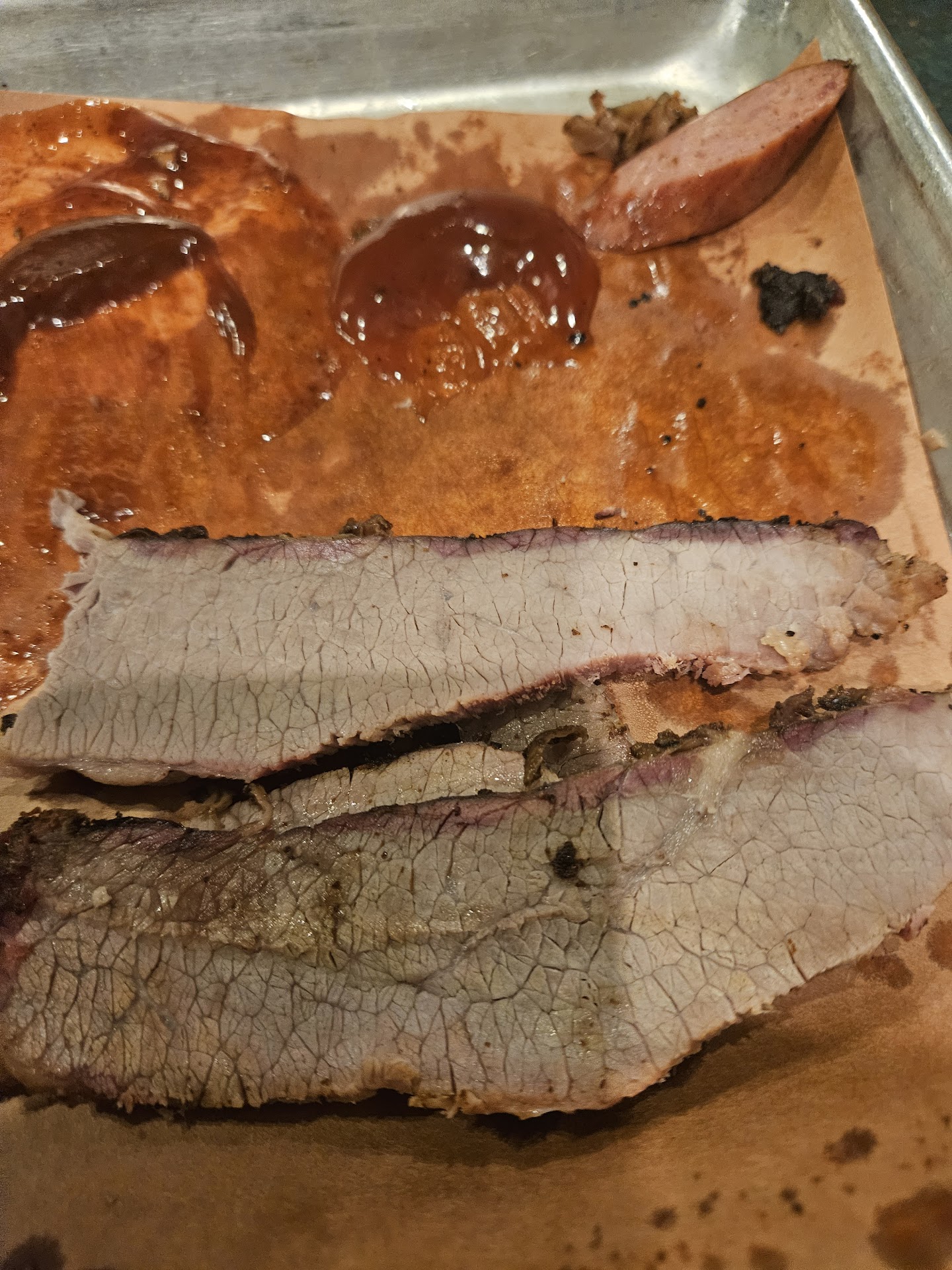 On to the food. At least for our meals, the other pictures here were lies. None of the meats had ever seen a smoker. 1% smoke ring. Oven baked only. The potato salad was loaded with preservatives, which 1 of our party is allergic. The baked beans were pork and beans only. The pinto beans were canned and had a strange taste. The collard greens were good. The pulled pork was, mostly, big globs of fat. The apple pie and banana pudding were not edible. Apple pie, dry but the crust was gooey. Sounds impossible, but true. The banana pudding was artificial banana pudding with brown, slimy bananas.
