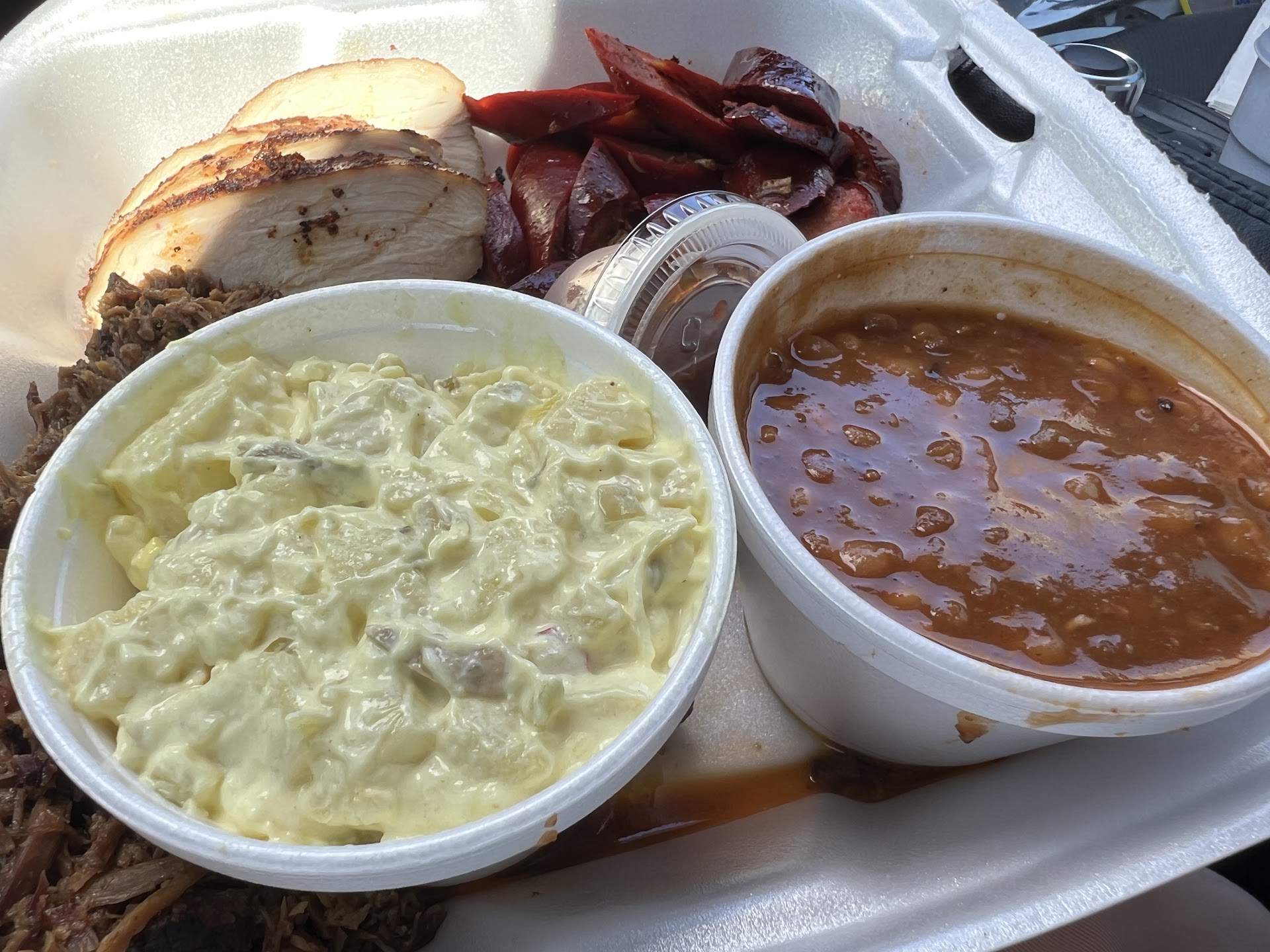 Our lunch was a major disappointment. As stated above, the meat was dry. We had brisket, sausage, chicken and ribs. My grandson was the first to point out that he could not eat his food because the BBQ sauce was so bad. By the time the rest of us in our party took a bite of our ribs, we could not even eat them either because there was so much vinegar in the sauce. We tried a different type of sauce and had the same issue.