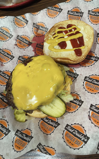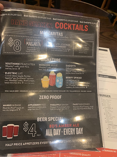 I'd been to the Bad Daddys in concord and loved the food so we were so excited to try this one out. We ordered fried pickles, a bad daddy's burger and a build your own salad along with two margaritas. The fried pickles were soggy and dripping oil. The burger was so greasy and the buns were so soggy it was nauseating. The salad had an entirely different set of issues. They give you a menu to write on so you can select all the toppings you'd like. When the waitress came over she asked my wife to list all the toppings she wanted. My wife politely asked if she could just give her the sheet with everything listed on it since that's why she thought she was asked to write her selection out but the waitress simply said no please read them to me. My wife read the items without protest but was a bit embarrassed as she had to list about 10 ingredients. When the salad arrived it had grapes rather than blueberries which my wife immediately called out (politely) because she doesn't like grapes. The waitress responded in the most unprofessional manner id ever witnessed. She made a face, changed her posture to a defensive arms crossed position and said "are you gonna make us remake it or can I just bring you blueberries? My wife said no need and she would eat it as is. The waitress brought the blueberries anyway and apologized saying " sorry but lots of people freak out over nothing and make us remake their food". I understand the let me talk to your manager culture that exists but if its happening often maybe something else is going on. In addition to all this, we only got one refill on our water and it happened when we were brought the check and only after I asked for a refill. The margaritas were enjoyable which was probably the only thing that kept us from being more upset. On our way out we noticed that the majority of the staff along with the manager were standing by the hostess area laughing and hanging out, which may have been why the attention to quality of their food and customer service felt nonexistent. Its unfortunate that our favorite burger joint in concord is our worst restaurant experience in moorseville. Maybe it was just a bad night for them but I'm not willing to spend another $75...