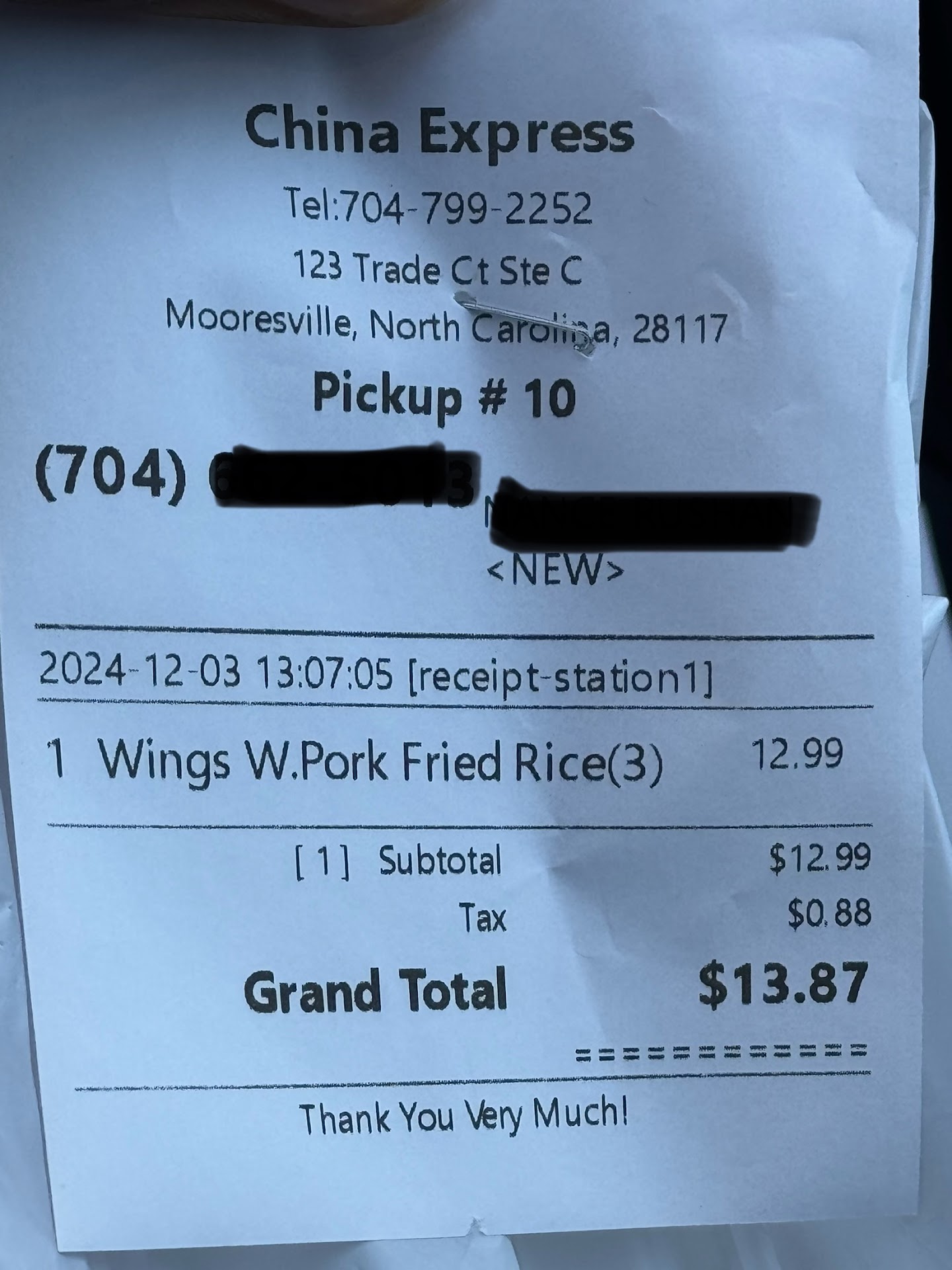 Read moreWhile on lunch I was craving some Chinese food. Ironically it’s an American staple and we consume a ton! As I placed my order and waited impatiently my mouth was already watering. The restaurant smelled like good wings and sesame chicken. The first bite was different but didn’t want to bash it until I was sure. The chicken was certainly marinated in something that made it crispy but the taste was off. Upon breaking the wing the interior of the wing looked like something that’s been sitting there for a while. I immediately lost my appetite. As for the rice the red meat was chewy as I’m assuming was the pork. I’m not saying all of their menu items would be this bad but I would think twice and probably call and ask about freshness before ordering. I’m never going back as the first impression...