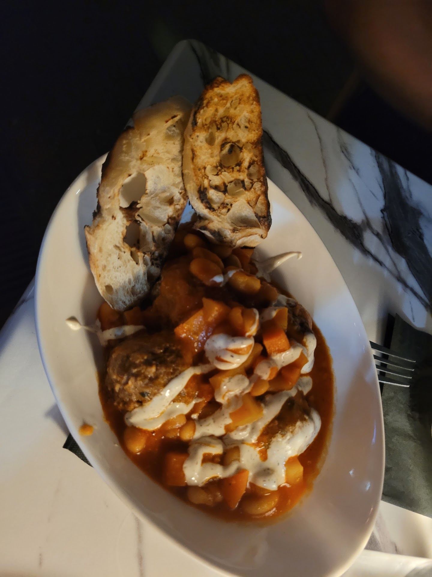 Read moreCame by on a Saturday night and sat outside under the market lights after sunset. The area was very pretty but I wish there was more ambient lighting once the sun went down. I had the coconut paloma cocktail and it was great and balanced. Meatball appetizer was delicious. The server and kitchen were very flexible with some of our requests on entrées. I had the firecracker shrimp wrap. Tasty and filling. I saw a "halal garlic" sauce on the menu - I thought it would be similar to toum but it was mainly herbal/dill flavored. Bartender was very friendly and made us a couple of fruity shots. Overall, really nice spot, esp for a date night or...