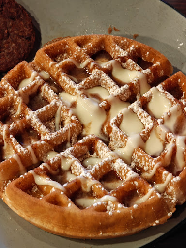 Now on to the food. The coffee was the worst I've EVER had, including that from gas stations and hotels - incredibly bitter even after adding 6 creamers and a BUNCH of sugars. At one point the GM came to check on us so we requested more creamers, but she never came back so we wound up asking another server to get them for us (which he thankfully did). I got the cinnamon roll waffle, which was actually pretty tasty (and fluffy), but the sausage patties (that were an extra $2, which wasn't mentioned or I would NOT have ordered them) were PAPER thin and overcooked. My husband got the southern omelet with grits and Texas toast and the omelet was also ok, but the grits were obviously the cheap kind and had been reheated, due to the texture.